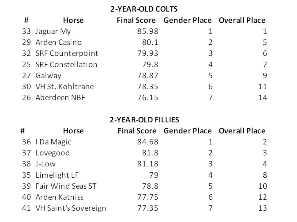 The Overall 2-Year-Old Reserve Champion title went to the top-placed 2-year-old filly, I Da Magic (Mighty Magic x Vanity Fair), a Holsteiner filly owned and presented by Anne Kaufman, on a score of 84.68. Third place overall for the 2-year-olds went to the 2-Year-Old Filly Reserve Champion, Lilly Steger’s Lovegood (Tatendrang x Lady’s Levitation), a Trakehner filly, on a score of 81.8.