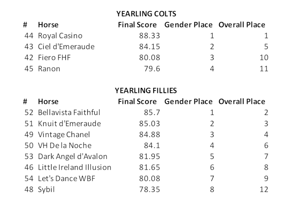 The title of Overall Yearling Reserve Champion was awarded to Bellavista Faithful (Arena Maestro x A Charming Pose), Jason Daisey's Cleveland Bay Sport Horse filly, who was also crowned the Yearling Filly Champion on a score of 85.7. The overall third place award for the yearlings was presented to the Yearling Filly Reserve Champion, Knuit d’Emeraude (Contendro I x Etoile d’Emeraude), on a score of 85.03.