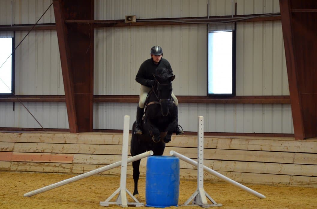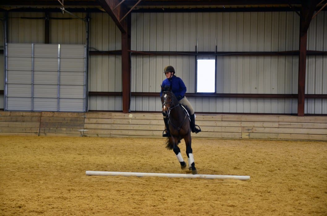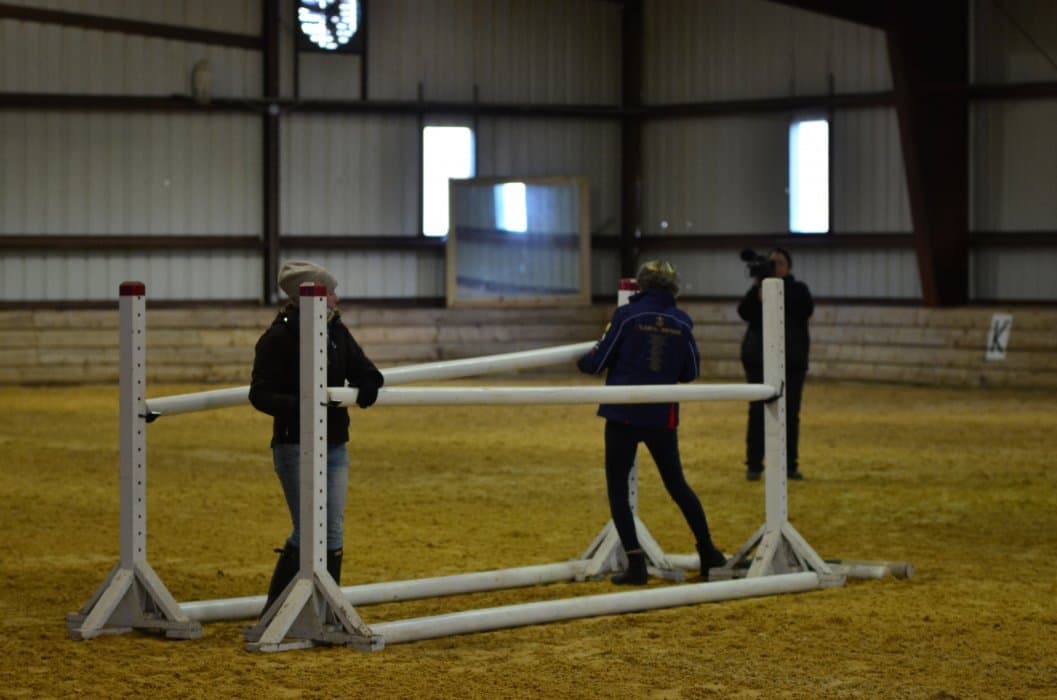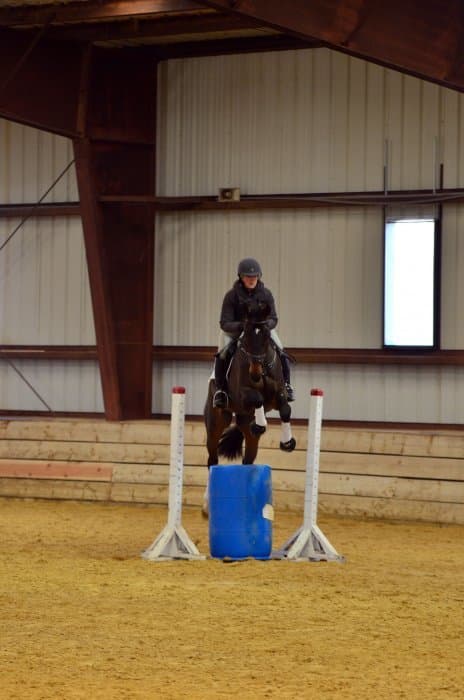Mary then introduced a narrow jump to the group, standing a barrel upright with two standards close by on either side. She asked the riders to jump through this a couple times to familiarize their horses with the skinny obstacle. Then, she incorporated a small course of technical questions: a bounce line, veering left 4 strides to a corner, looping around to the narrow barrel, veering right 4 strides back down the bounce line the opposite direction.