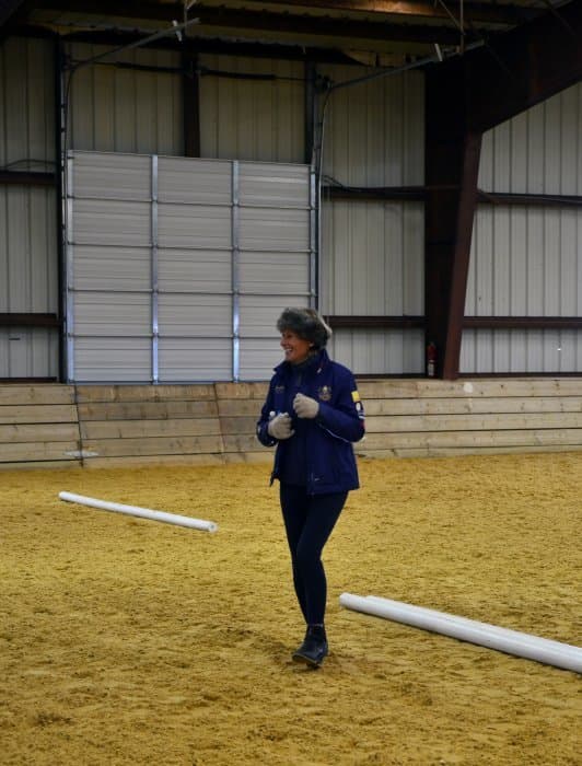In every group that rode on Thursday, Mary used a circle of four canter poles on the ground to discover the strengths and weaknesses of each horse and rider. She asked the riders to count the number of strides they were getting between each of the poles and to try to keep it consistent.