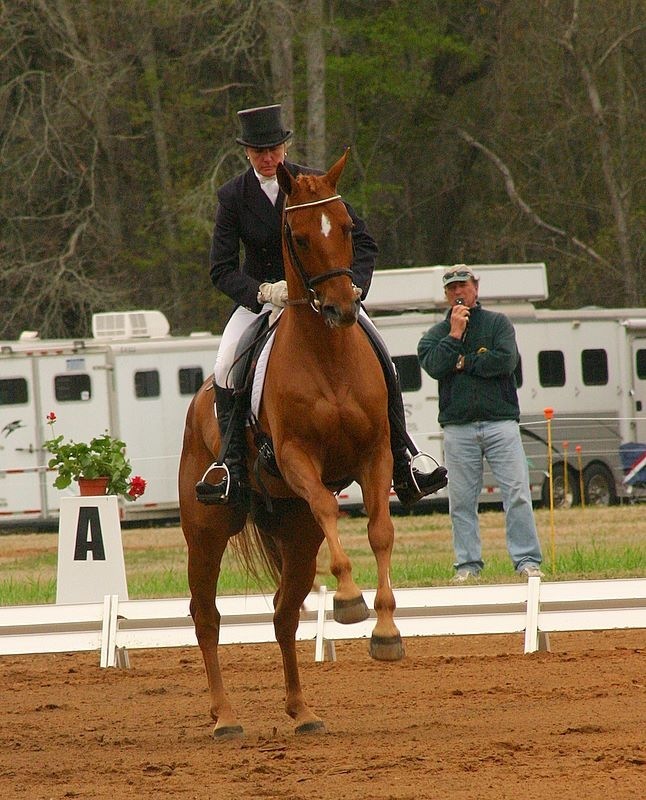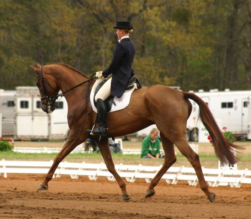Nippity nip on her heels is (not too surprisingly) Allison Springer and Arthur (right) with a 43.4. I have to say that I absolutely LOVE this pair. Sweet local (well, local to me anyways) girl and her neat well-bred gelding (by Phyllis Dawson’s Brandenburg’s Windstar) are constantly putting forth above-average, mature dressage tests. The scores speak for themselves… not too much over 40.0, and a few leaking down into the 20′s… !!