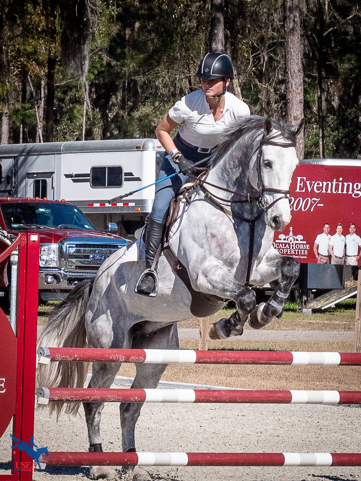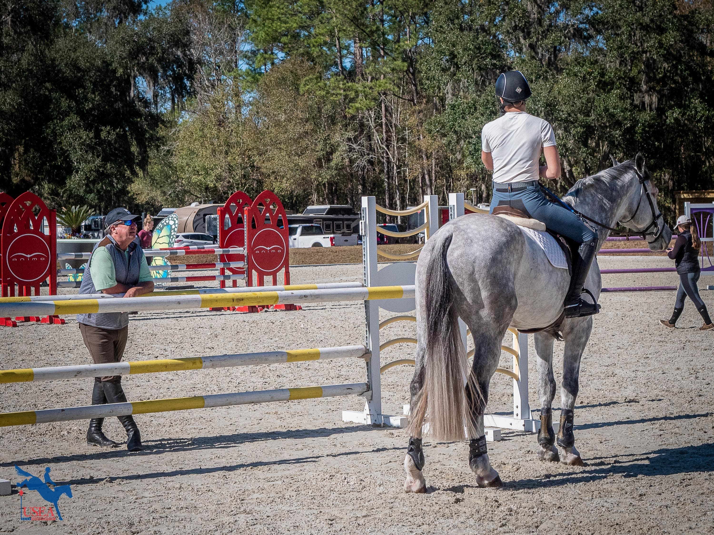 Bright and early this morning, the riders set up a schooling jump course with eventing show jumping course design expert Chris Barnard. Barnard walked the course with participants, discussing striding and why he set the lines in the manner that he had. One of the big takeaways that Barnard discussed was the importance of color choice for elements of a jump course. He explained that thought needs to be given to how the horse perceives color in choosing colors for each jump. Key considerations included: The color yellow can be perceived similarly to the arena footing to horses, so if yellow is incorporated on course, it must be striped. Similarly, red and green are viewed by horses in the same way, which is why a cross-country jump should never be red so as to not blend in with the green grass footing.