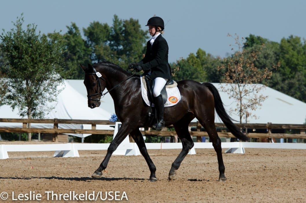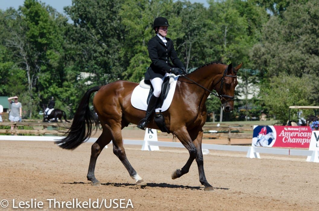 Katherine Groesbeck (CA) and her family’s homebred Oz The Tin Man, were the fifth to perform in the Advanced Championship division. Their score of 27.7 was good enough for first place in a very competitive division. Last year was their first season at Advanced, and Groesbeck feels like the horse is at the top of his form.