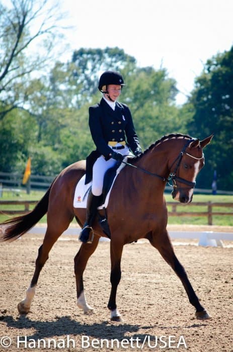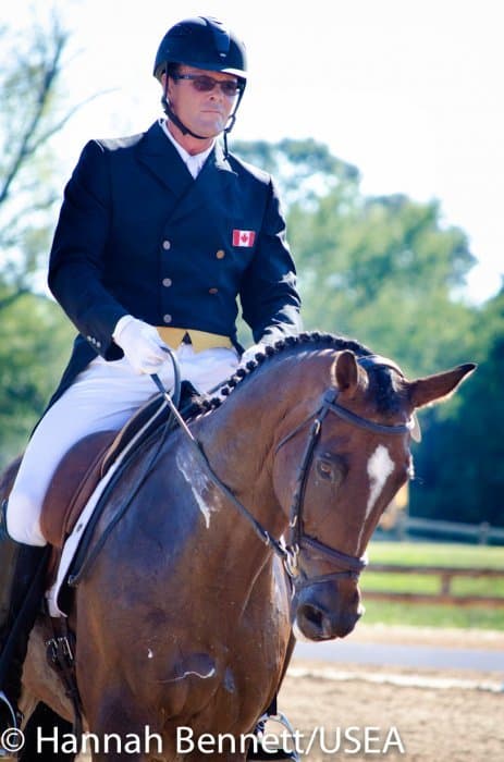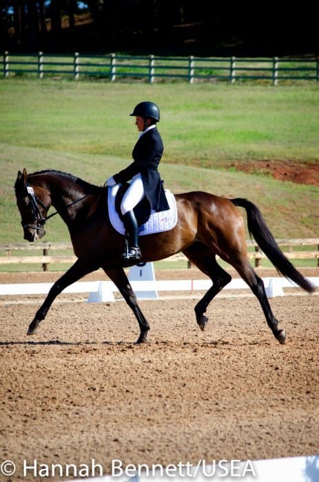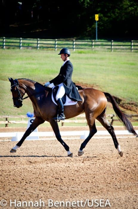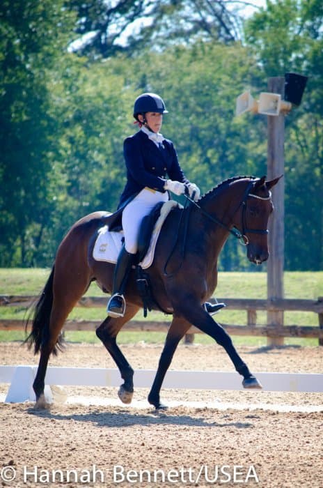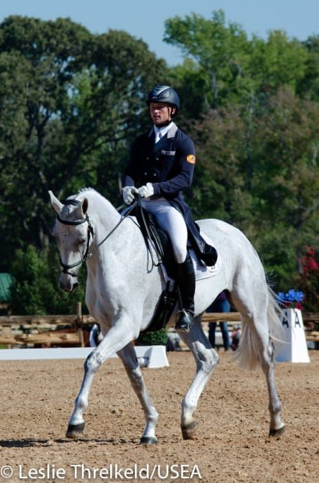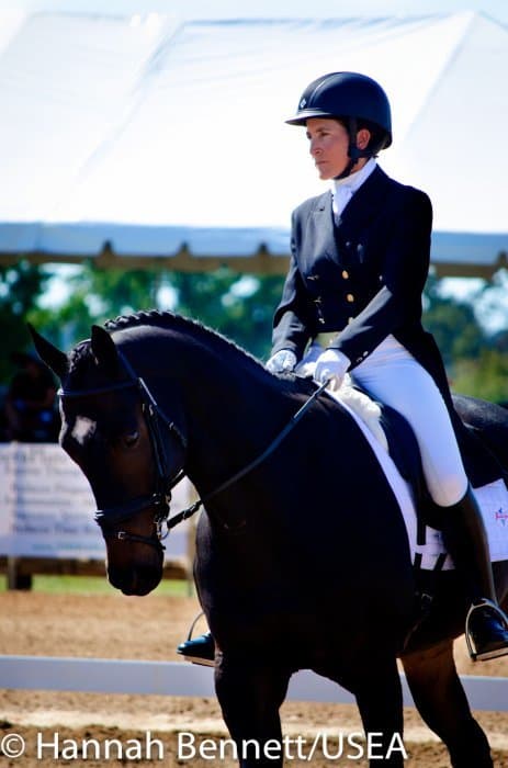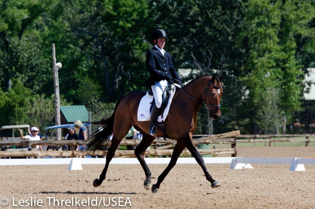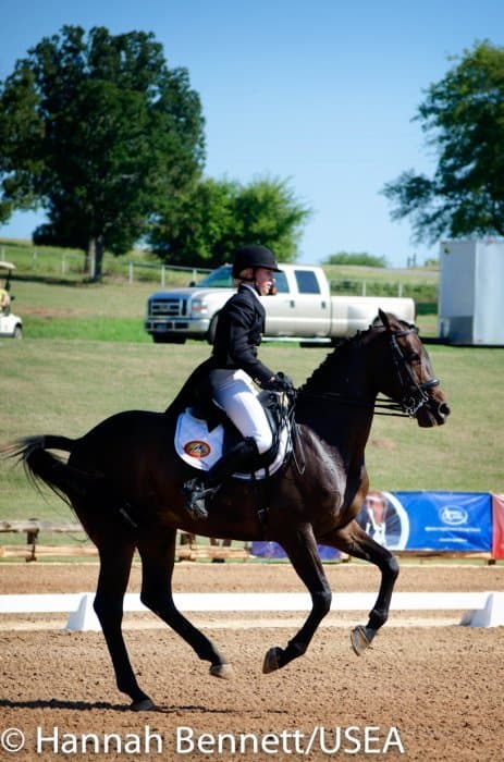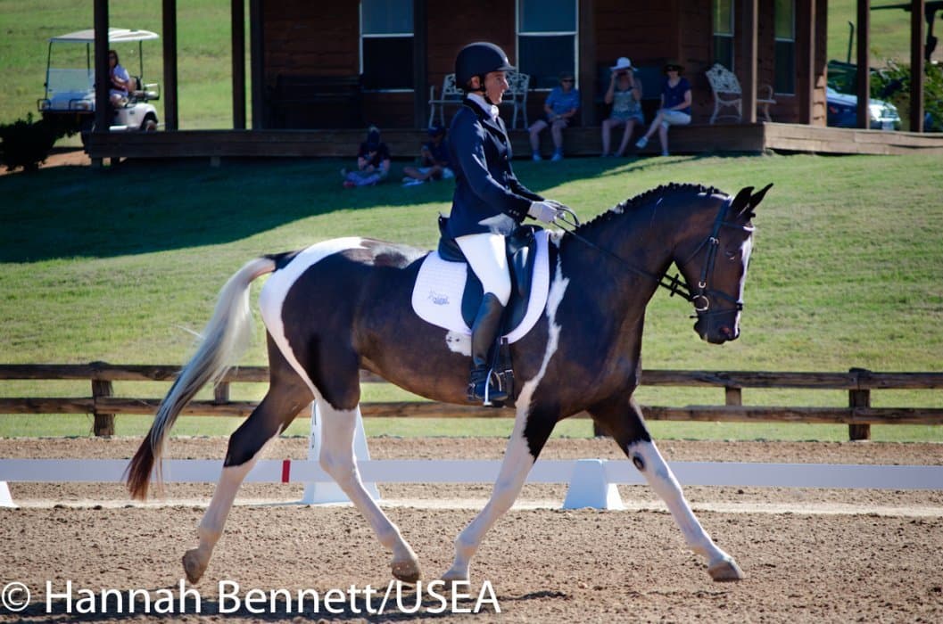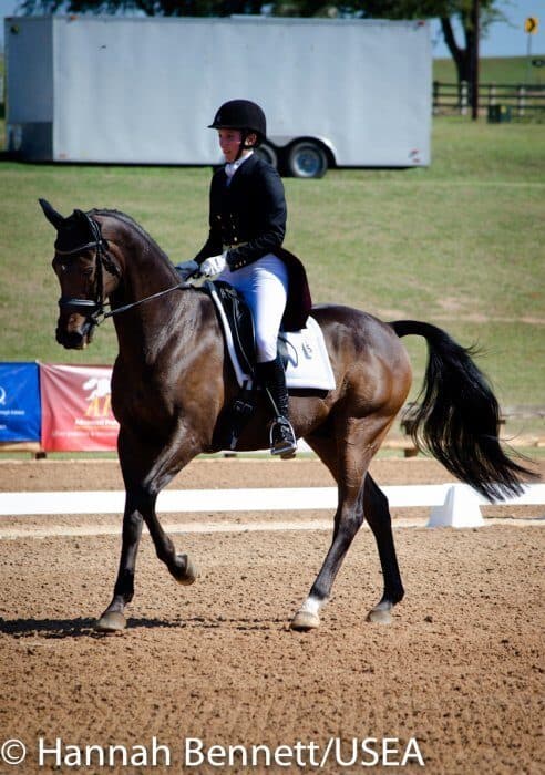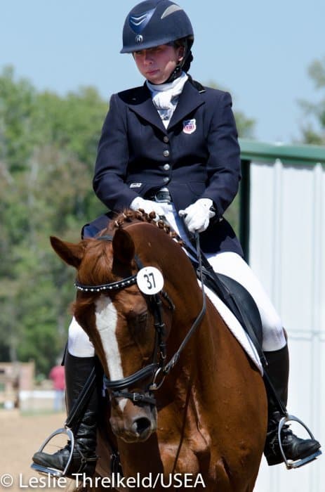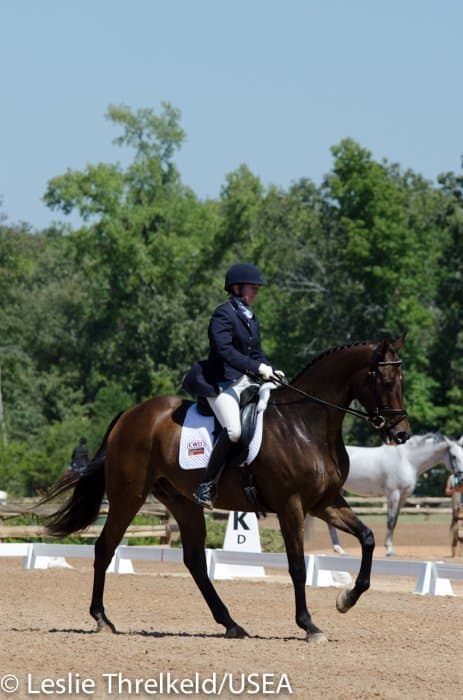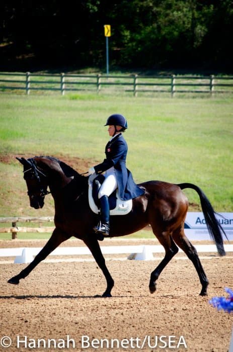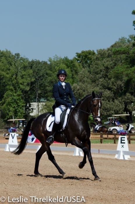Californian Frankie Thieriot has spent the summer training and competing in Pennsylvania and came to Texas to compete Tory Smith’s Uphoria. After producing an extremely accurate test, she and the mare sit tied for second with a 27.6.