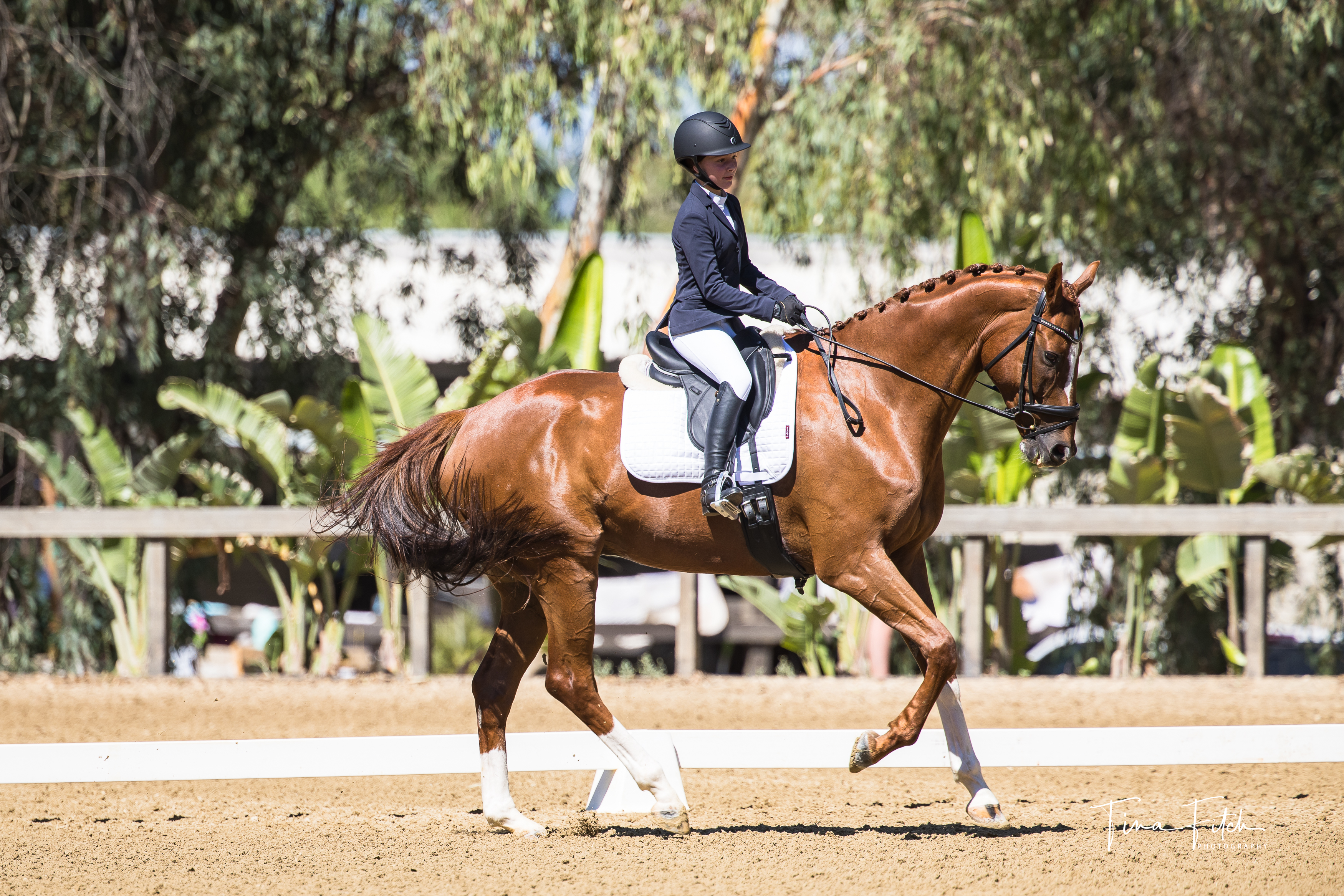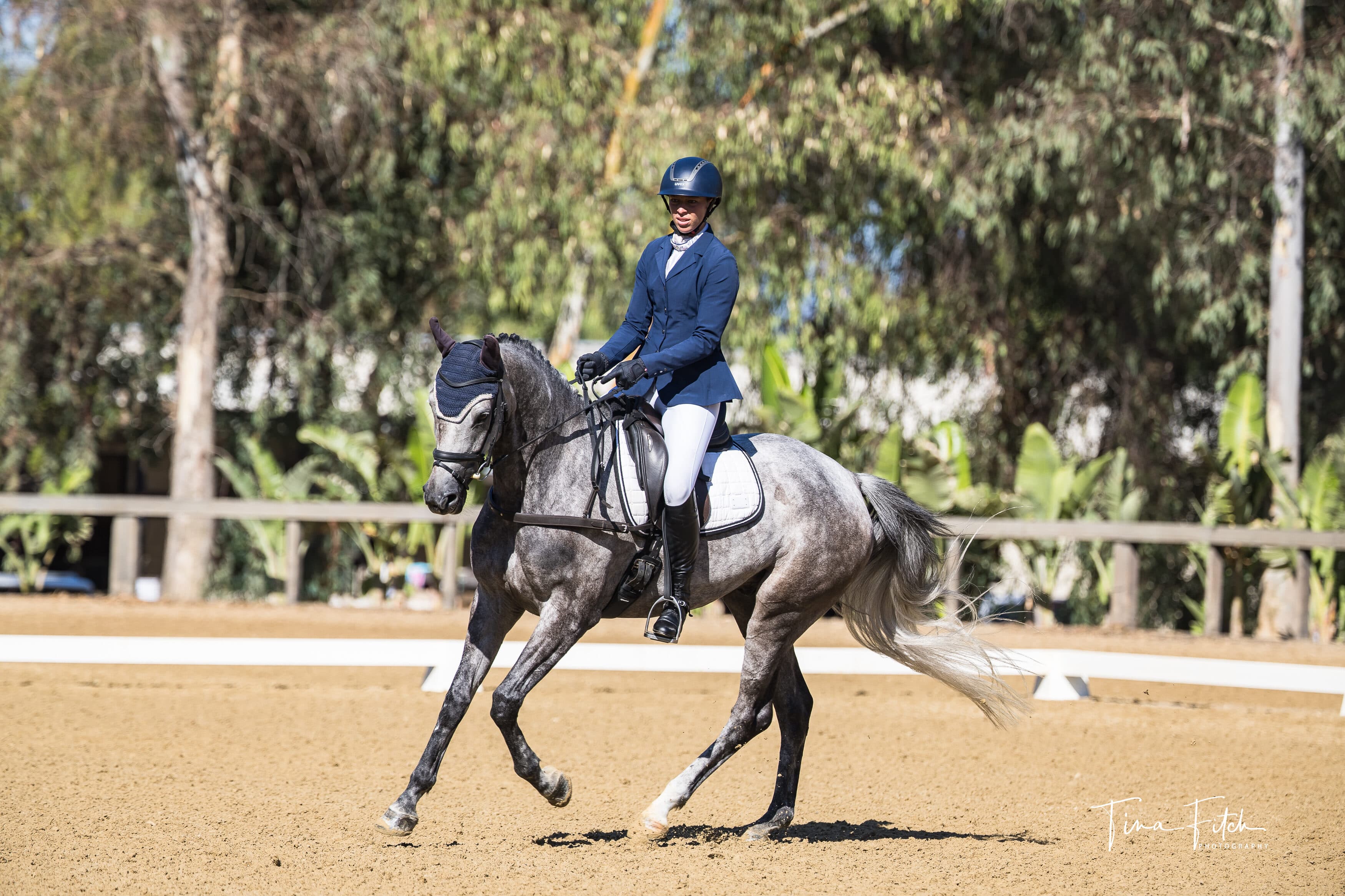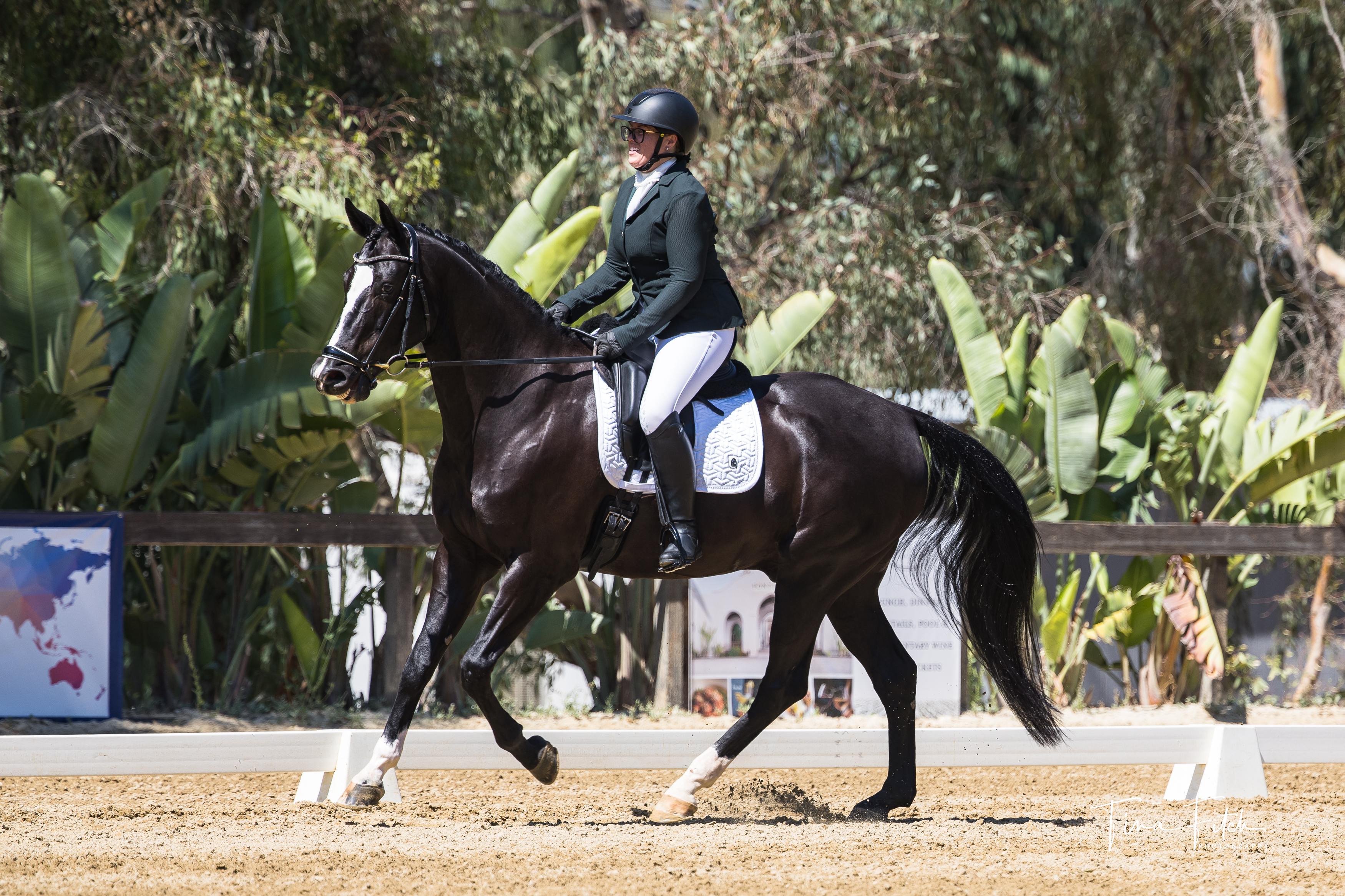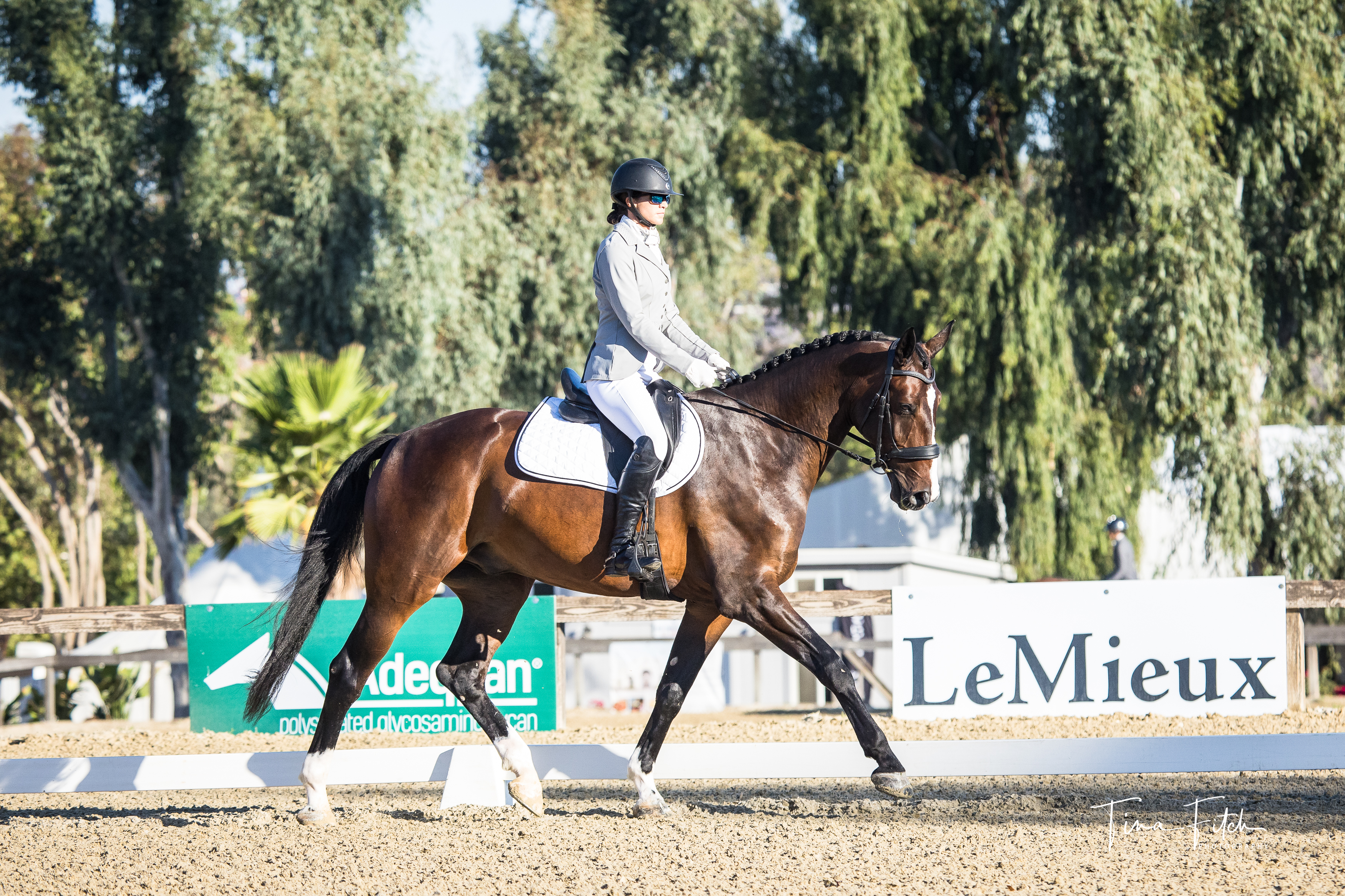 Gretchen Pope of San Anselmo, California, and her 6-year-old Dutch Warmblood gelding Optimistic Sol (George Clooney x Frizzle Liz) currently sit atop the pack with a 25.8 in the 27-horse division.