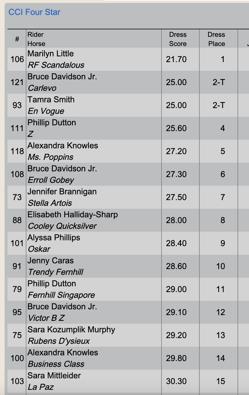 There is currently a tie for second on a 25.0 between Buck Davidson and Carlevo (Eurocommerce Caresino x Ramatuelle), 14-year-old Holsteiner gelding owned by Carlevo LLC, and Tamra Smith and Ruth Bley's 16-year-old Hanoverian mare En Vogue (Earl x Laurena).