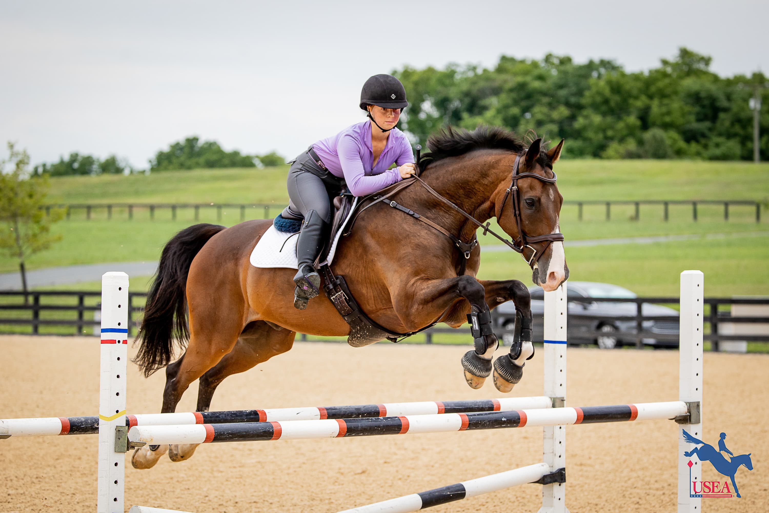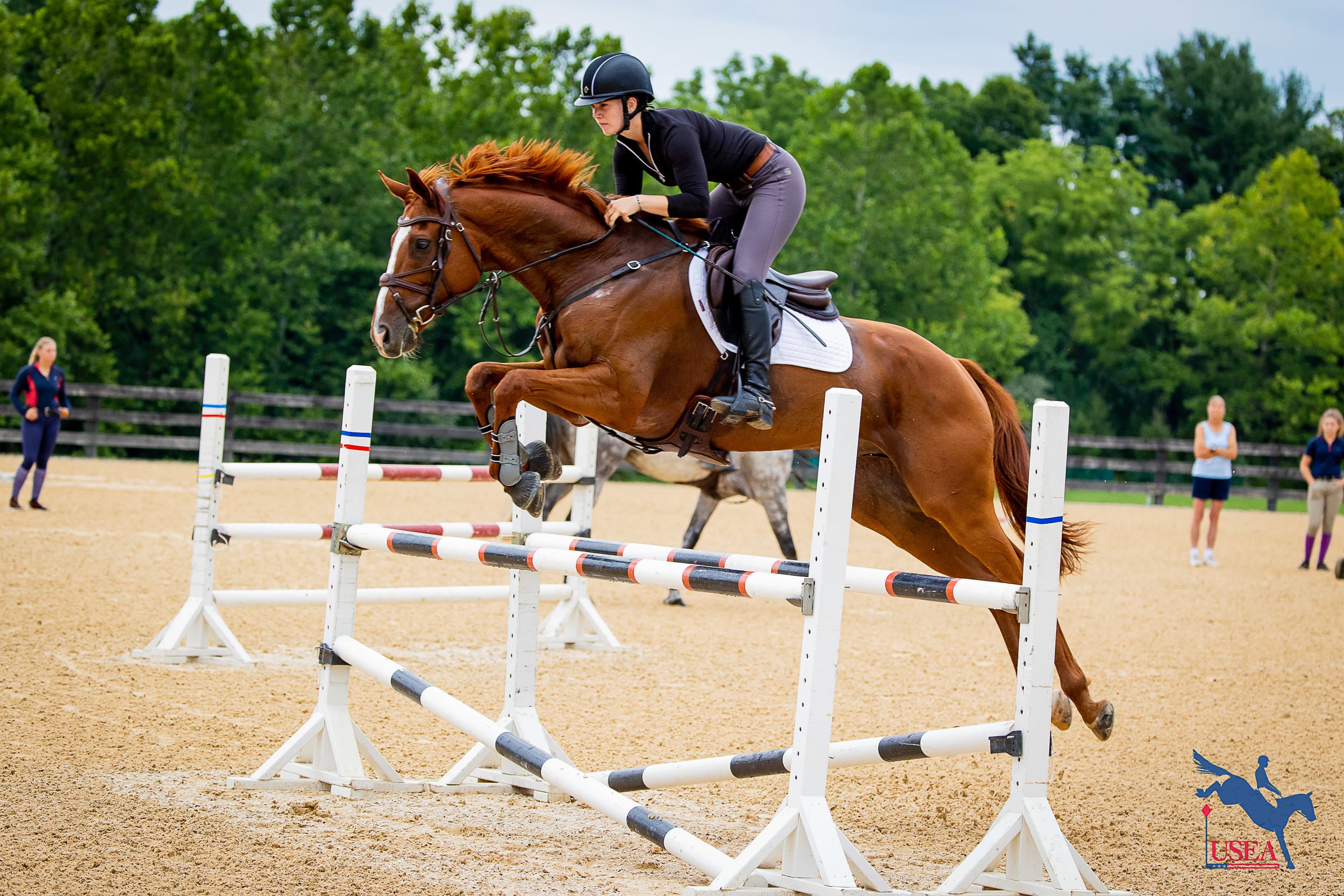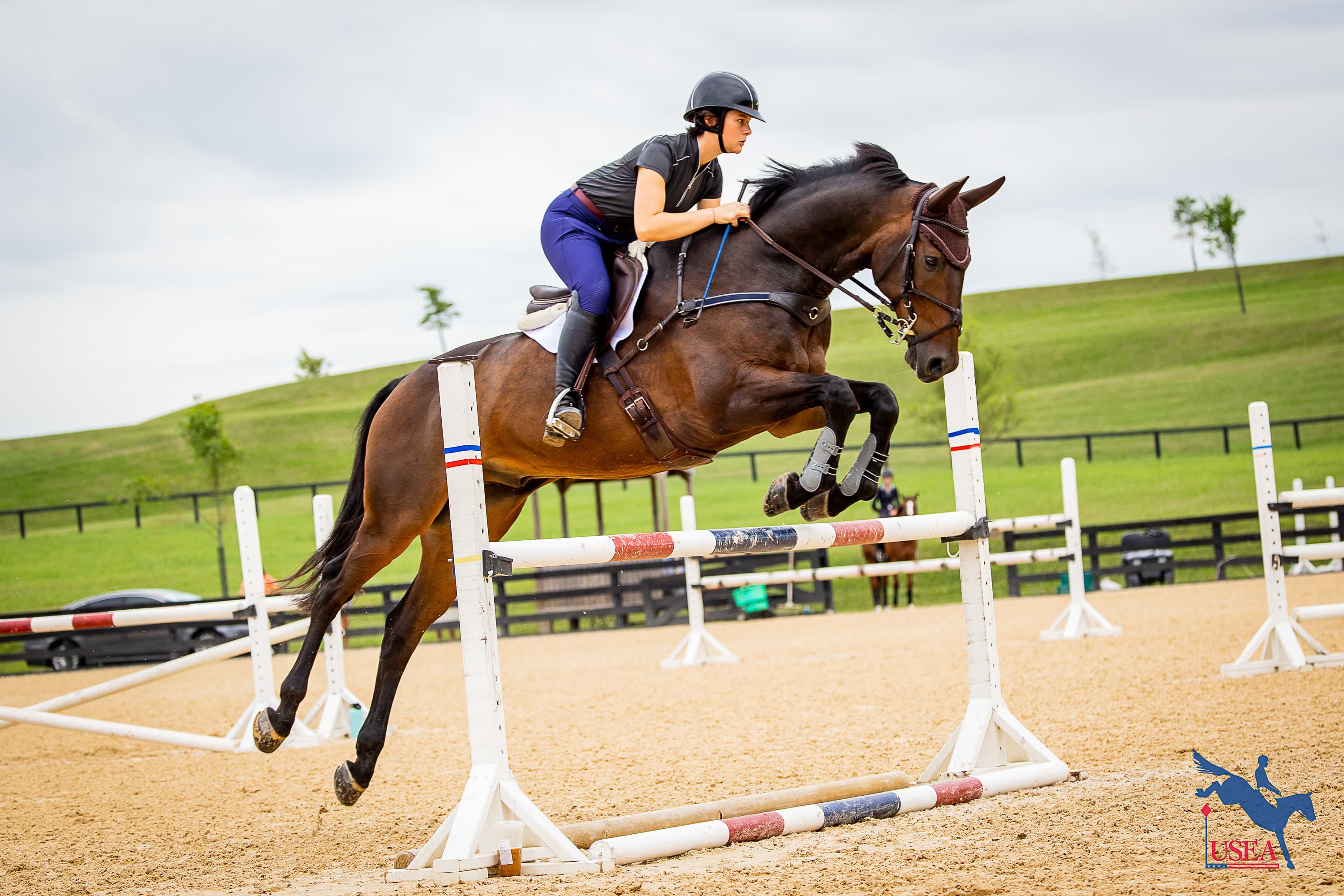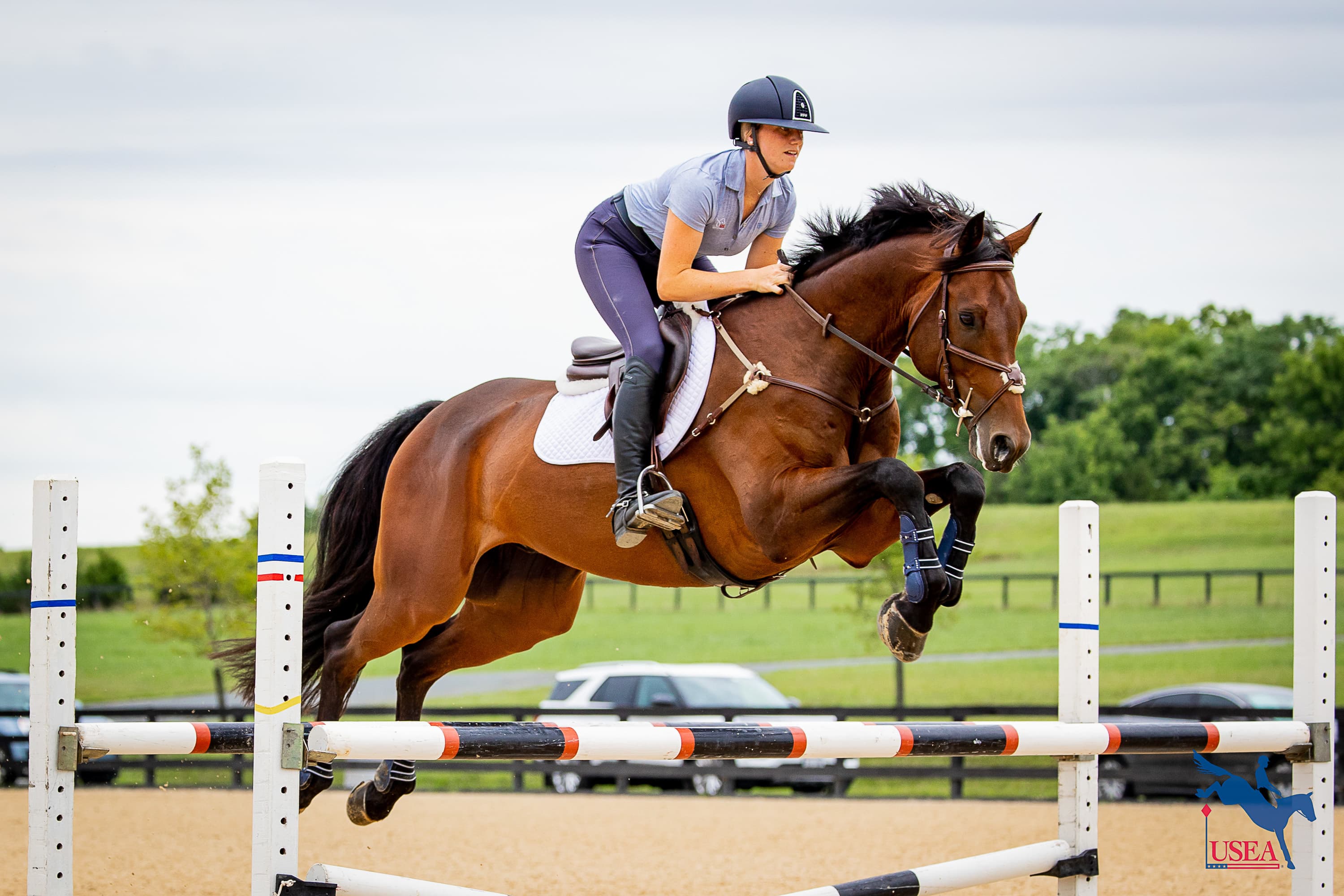During day two of the USEA Emerging Athlete Clinic (EA21), Pan-Am gold medalist and ICP instructor Shannon Lilley connected the dressage work from Day One with a series of over-fences exercises. Their first exercise was two verticals set on a figure-eight. The goal of the exercise was to use the arena fenceline to get square to the verticals. This could be achieved by not overbending in the turns. EA21 Coach Lilley suggested coming out of the figure-eight loop with slight flexion to the outside, which enabled the rider to get their hips and the horse's hips straight. She was looking for a balanced, rhythmical canter that stayed the same around the figure-eight.