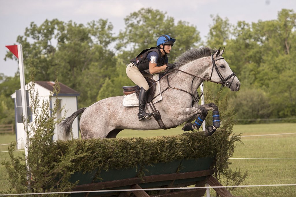 Corinna Garcia, Ft. Wayne, Ind., and her 8-year-old Thoroughbred gelding Gun Slinger during their steeplechase run. They finished endurance day maintaining their first place position in the IEA Classic Training Three-Day. Allen MacMillan Photo.