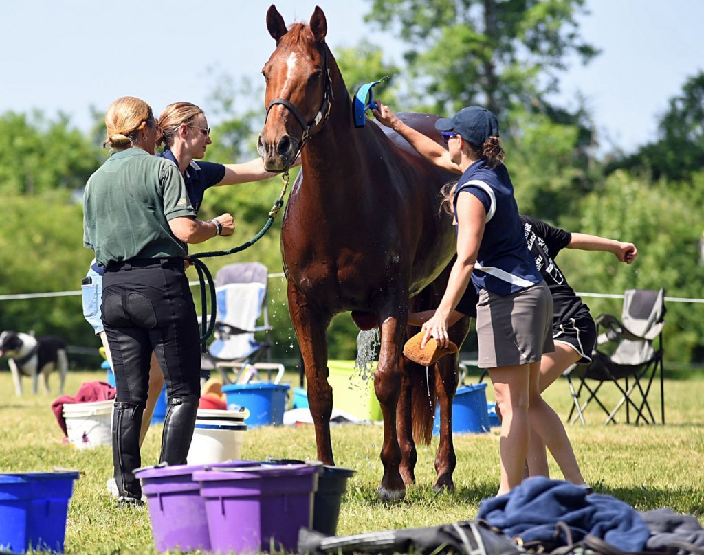 Novice Three-Day rider Mary McSweeney’s crew works on cooling down her mare Indian Summer in the vet box after they finished endurance day at the IEA Horse Trials. Kim MacMillan Photo.