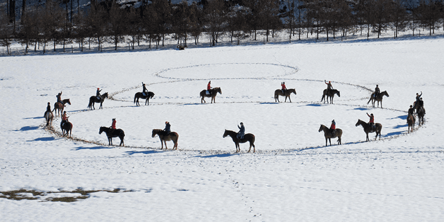 Here’s one way to practice your circles – make a perfect snowman! A group of eventers at Liz King’s Millington Stables in Charlottesville, Virginia enjoy the winter weather in style. Liz King photo.