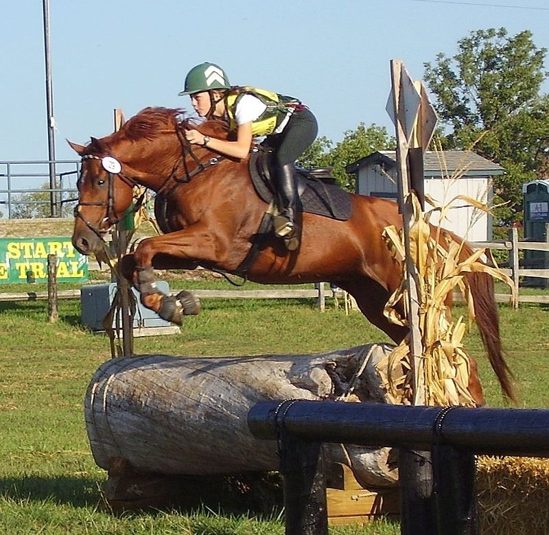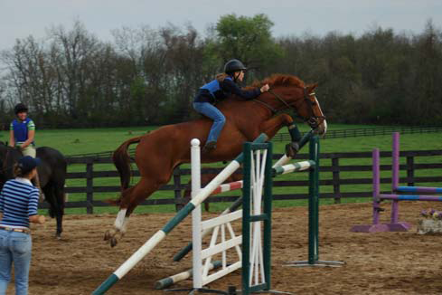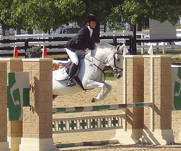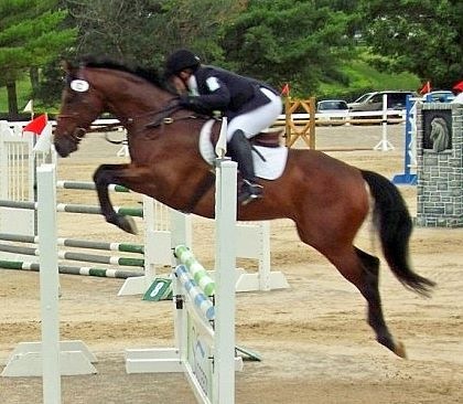 Ali is the younger sister and, as usual in siblings, she’s the opposite of Becca – bubbly, giggly, and I’ve never seen her without a smile on her face. She competed Dapple through Novice (pictured below right, at a Pony Club rally), and has been/is a serious Pony Club member. When Dapple’s age and Ali’s ambitions exceeded Dapple’s abilities, we leased “Direct Impact” (Colin) to Ali for a season. Colin is a story of his own – he was a teaser at Lane’s End, and by 6 years old had lost interest in his career. After adjustment of his weight distribution (e.g., gelding), he became one of our favorite horses and Ali rode him through a successful Novice season. When she indicated an interest in upper level eventing and NAYRC, however, we found her a 4 year old Thoroughbred gelding (“Alex,” Spring Loaded). She bought Alex and has never looked back – he’s carried her to her first training and first preliminary, and they’re now a solid preliminary team at 15 and 6 years old, respectively (Top Right: Ali & Alex competing at Prelim at Jump Start Horse Trials) . Ali’s developed a strong riding resume, including riding Megan’s advanced horse Widespread Panic in our bareback puissance competition (pictured left) at 4’9”.