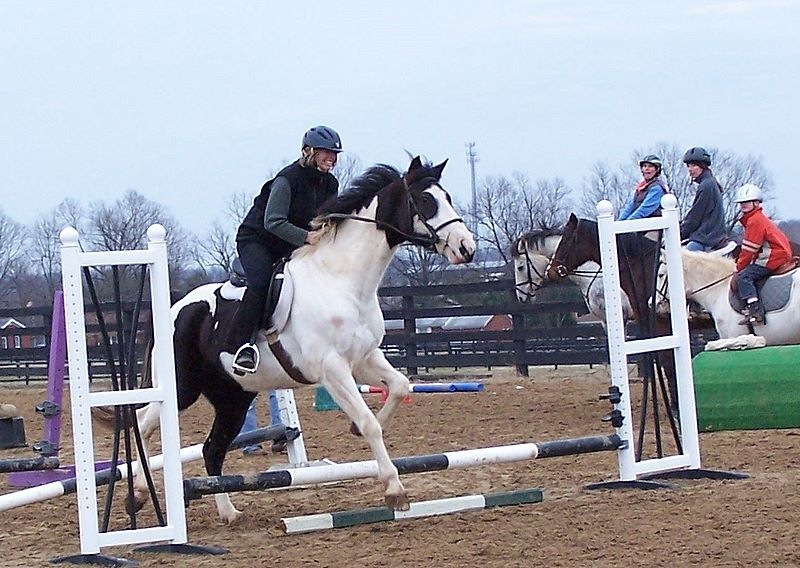 Mike wanted to buy her an Appaloosa gelding, but then we found Othello, a brilliantly colored black and white overo (shown here at left during a stadium lesson at TeamCEO), and a true partnership blossomed. Othello is the sweetest horse in the world. His favorite gait is walk, followed closely by “Whoa” – or maybe it’s the other way around. He and Hope have forged a wonderful relationship, and she has shown him successfully in two of our farm shows. Look closely, in all of her pictures she has a beautiful smile; I didn’t pick them that way, I just can’t find any where she’s not smiling! And why were the XC vest and tall boots an appropriate birthday present? Because, in Hope’s words, “I guess it’s time for me to event!”