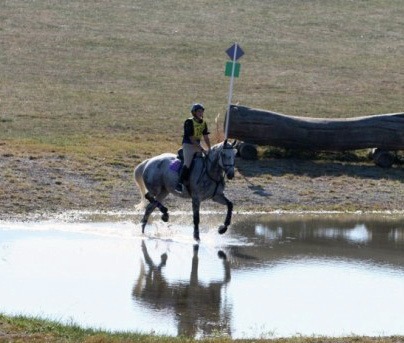 Pongo’s been called a “heat seeking missile” when he goes on course, and I’ve even seen him alter his route to move back under an off-balanced rider! And the exciting news – Hannah has a new horse, a 17’2” grey thoroughbred gelding, The Aristocrat!! (pictured right).The new team is shown in their first competition together at the Jump Start Horse Trials. She’s also become experienced enough to help others just starting the sport.