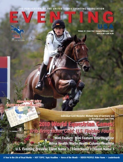 The USEA is pleased to announce a new presence for its award-winning magazine, Eventing USA! Beginning in 2011, the official publication of the USEA will expand its frequency to offer ten issues of its four-color magazine each year, including new features and resources for members. Previously, the magazine was published bi-monthly, so we hope our members will enjoy these exciting additions.