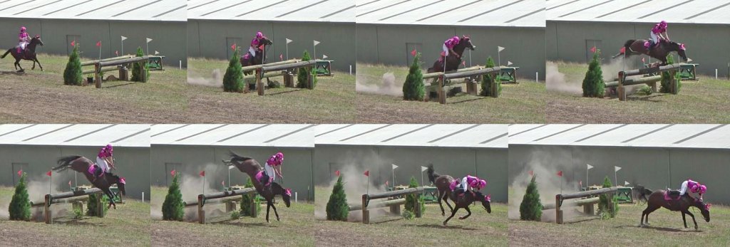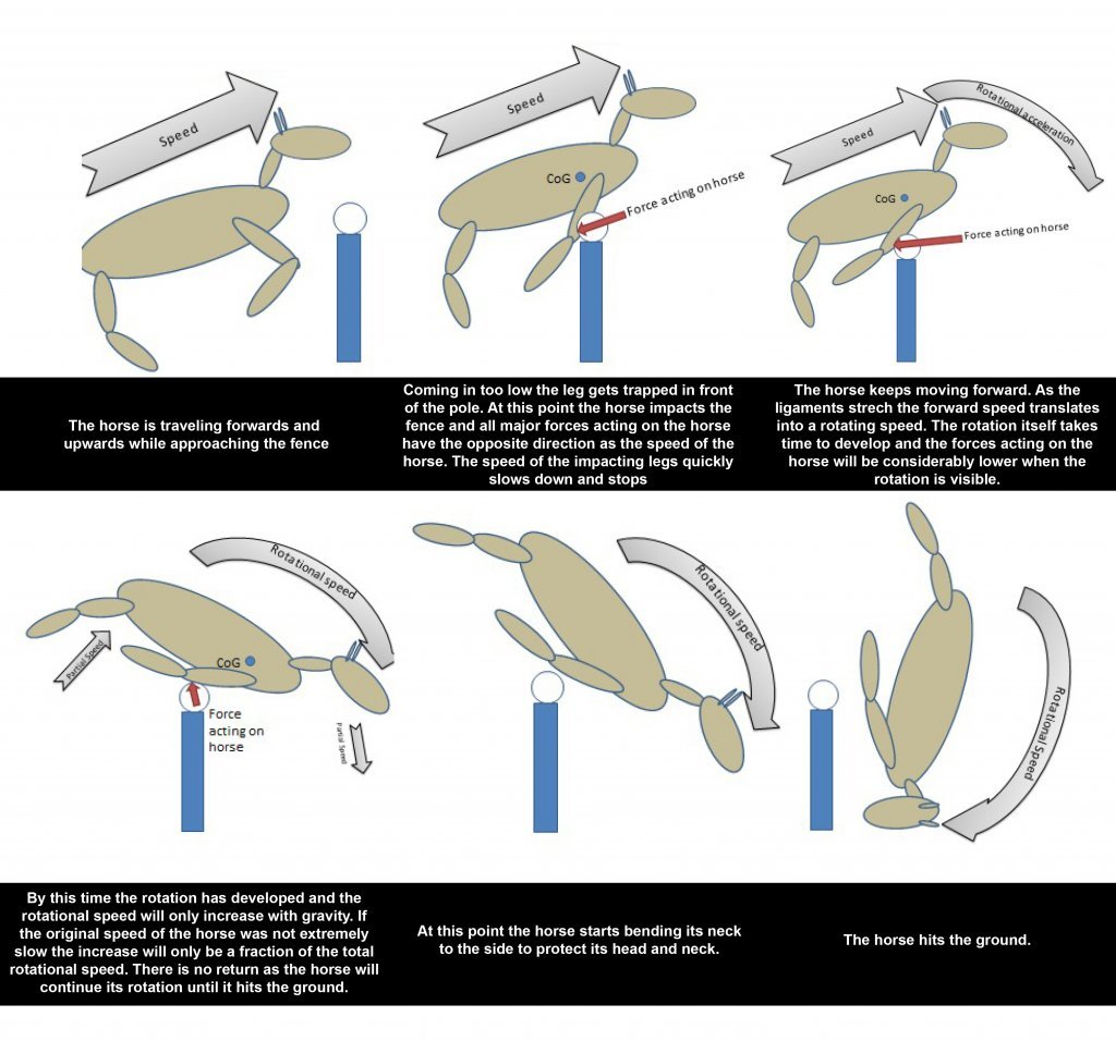 A rotational fall typically happens when a horse hits a fixed fence (usually on take-off) with sufficient vertical upward and horizontal force that it causes the horse to somersault. Once the horse has started to rotate the situation is irreversible and a rider has 0.9 seconds to respond. If the horse lands on the rider in a full rotational fall, it is likened to the effects of a 2 ton wall falling directly onto the rider, there is little chance of survival.