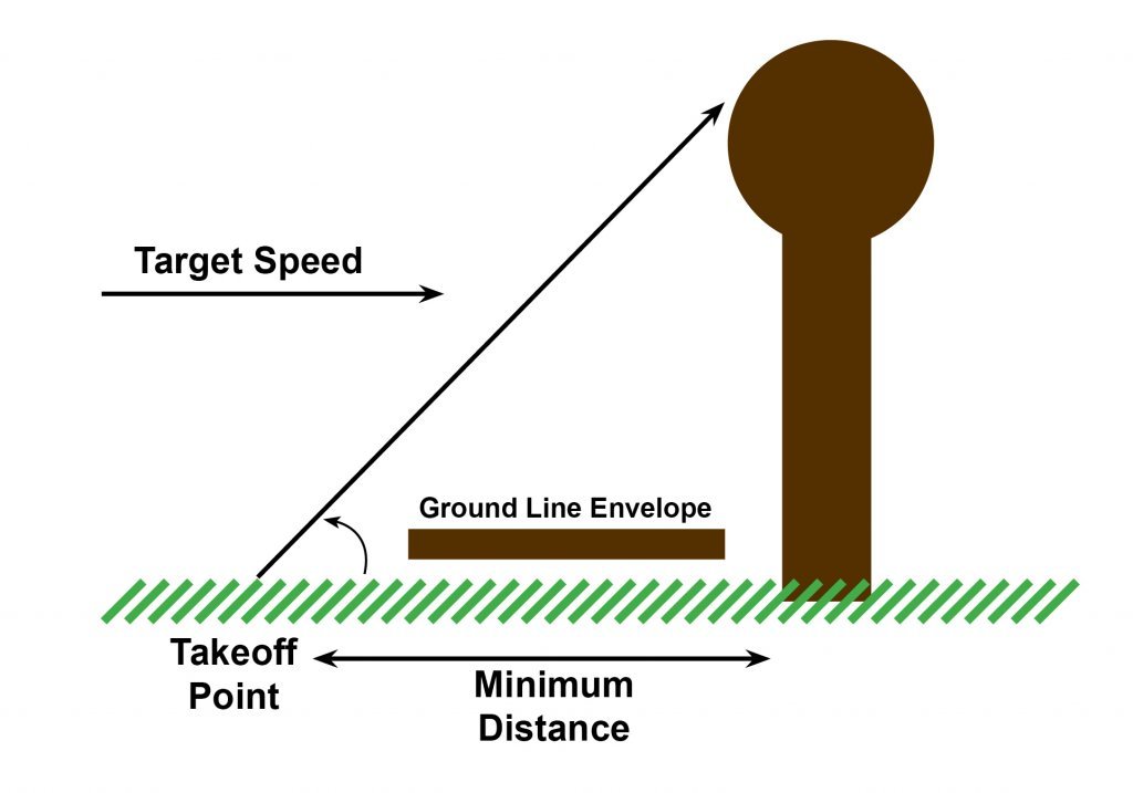 Distance needed to complete the pitch up maneuver ahead of a jump, when approaching the jump at the target speed. This defines the closest take off distance from obstacle that will prevent contact with the jump before completion of the pitch up maneuver. Placing ground lines to encourage takeoff from no closer than the minimum distance is intended to help reduce risk of the horse's front leg(s) making contact with the top/front of the jump.