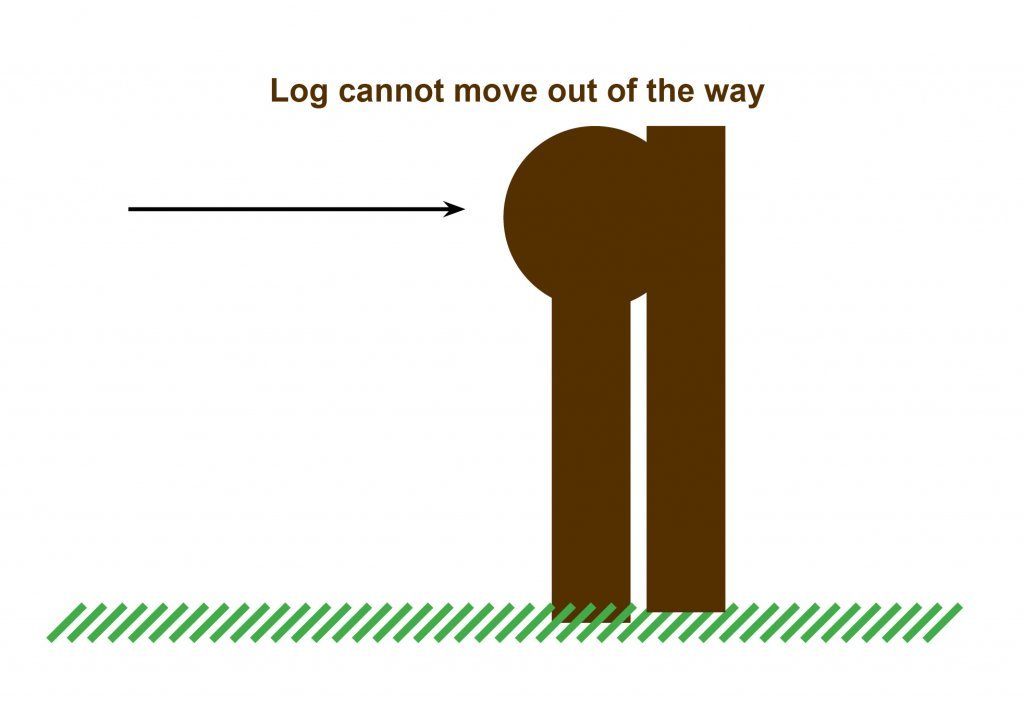 Obstacle design such that it is light enough and properly constrained to move out of the way upon severe enough impact. Note the improper mount of the third diagram: in this case, no matter how light or disengaged the log is from the jump, it is blocked from motion in the direction of the jump by the vertical back posts and cannot move out of the way.