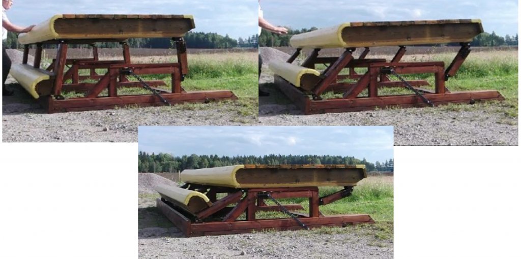 The table is activated by a force driving it forward in the jumping direction. It then moves forward and down. The front is moving quicker down than the back of the table which moves down a little later. This difference can be seen in the three pictures above as a slight angle towards the front in the middle picture. This is to do to the fact that we need to make clearance between horse and fence as quick as possible.