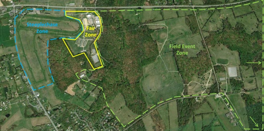 The study identifies an overall goal to relocate much of the Fair Hill CCI2*/3* competition to the “Fair Zone” which is located at the east side of the steeplechase track. The CCI competition currently takes place in the "Field Event Zone" of the property.