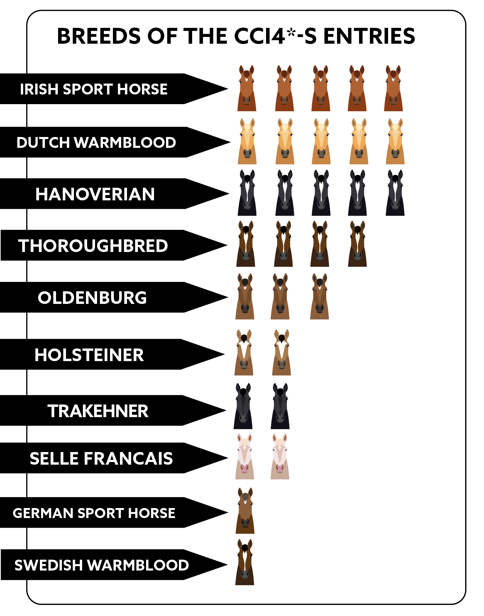 - Fourteen horses are using the CCI4*-S as a prep run before heading to the Land Rover Kentucky Three-Day Event CCI5*-L later in April: Bolytair B, Deniro Z, Favian, K.E.C. Zara, Mai Baum, On Cue, Palm Crescent, QC Diamantaire, Quantum Leap, Steady Eddie, Tsetserleg TSF, Vandiver, Voltaire De Tre’, and Wizzerd. There are another seven in the Advanced aiming for Kentucky: Business Ben, Cecelia, Islandwood Captain Jack, Long Island T, Mama’s Magic Way, Pfun, and Qorry Blue D’Argouges.