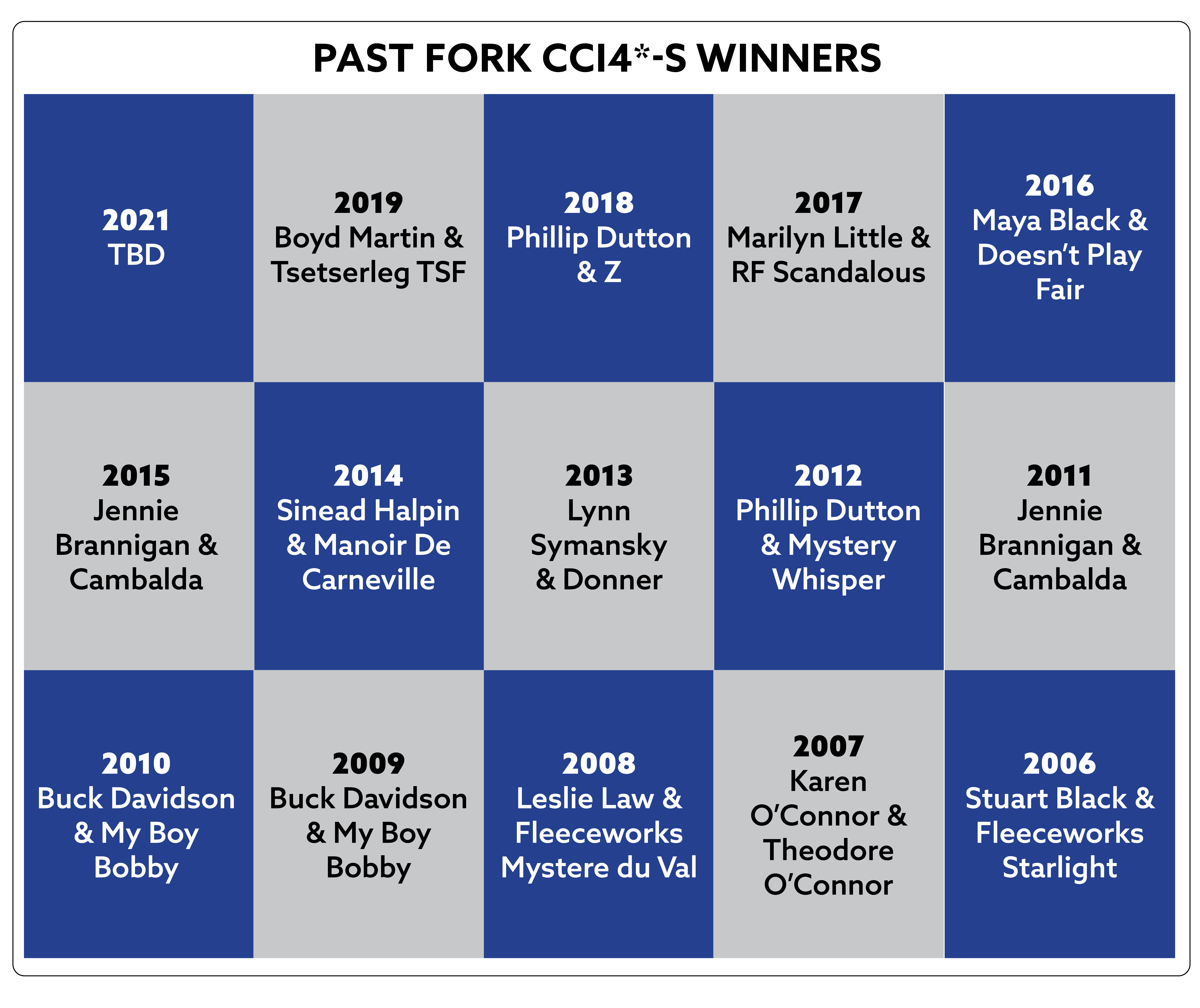 - This is the 15th edition of the CCI4*-S at The Fork (previously the CIC3*). In the past 14 competitions, there have only been two pairs to win it twice: Jennie Brannigan and Cambalda and Buck Davidson and My Boy Bobby (the only pair to do it back to back). With the 2019 winners entered there’s a chance of the third pair to be added to the history books – can Boyd Martin and Tsetserleg TSF do it?