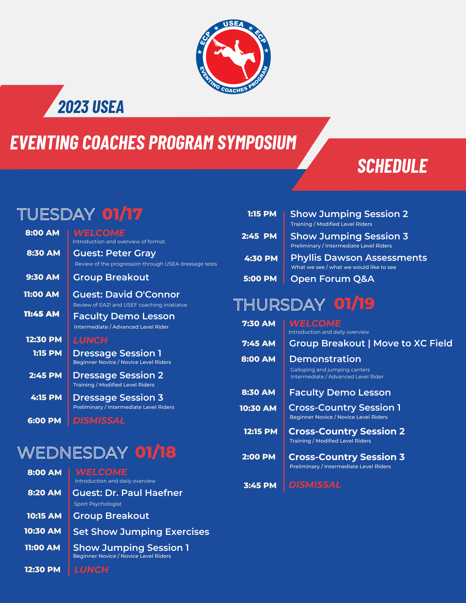 - For the second year in a row, participants will be broken into interactive small groups of attendees and ECP Group Leaders. Each group will evaluate and discuss each individual horse and rider combination to form consensus on how best to progress that pair forward.