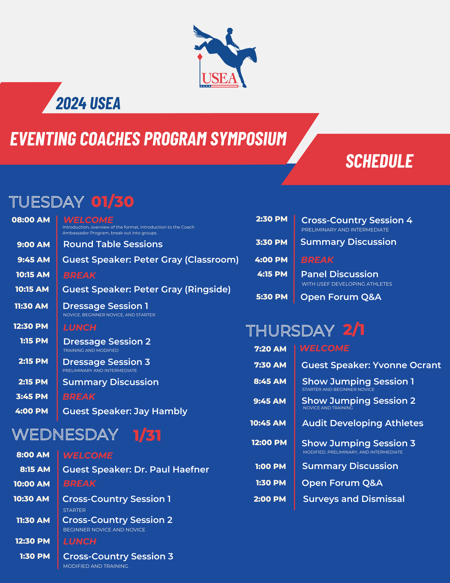 Advanced registration is greatly appreciated, so click here to register now. On-site registration will also be available tomorrow for those that did not pre-register. If you have any questions about the ECP Symposium or the Eventing Coaches Program, please contact Nancy Knight, Senior Director of Education, at [email protected].