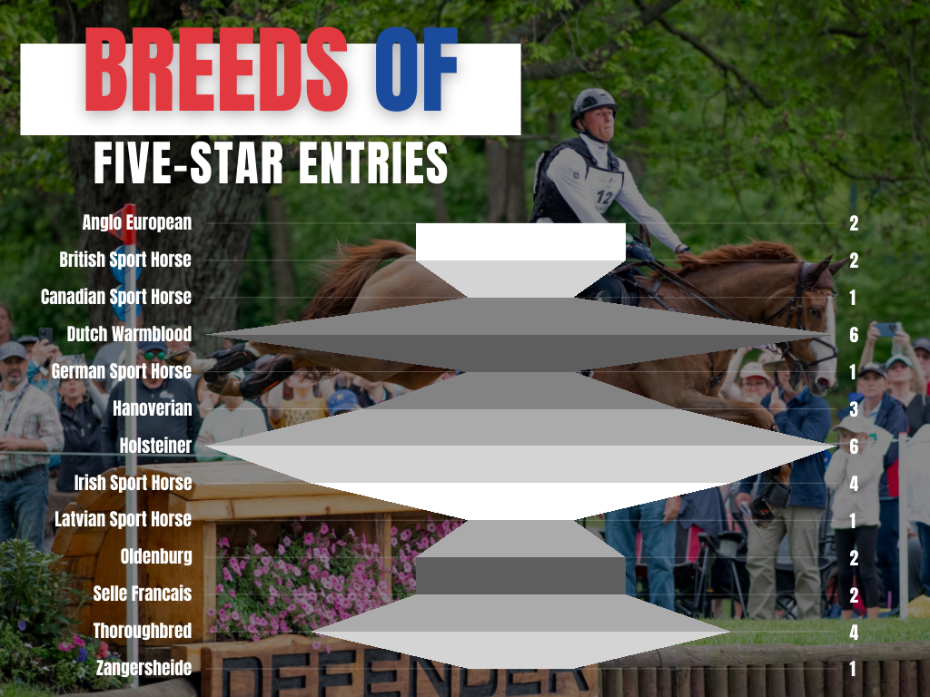 - The Dutch Warmblood and Holsteiner breed are tied for biggest representation in the field, each with six entries.