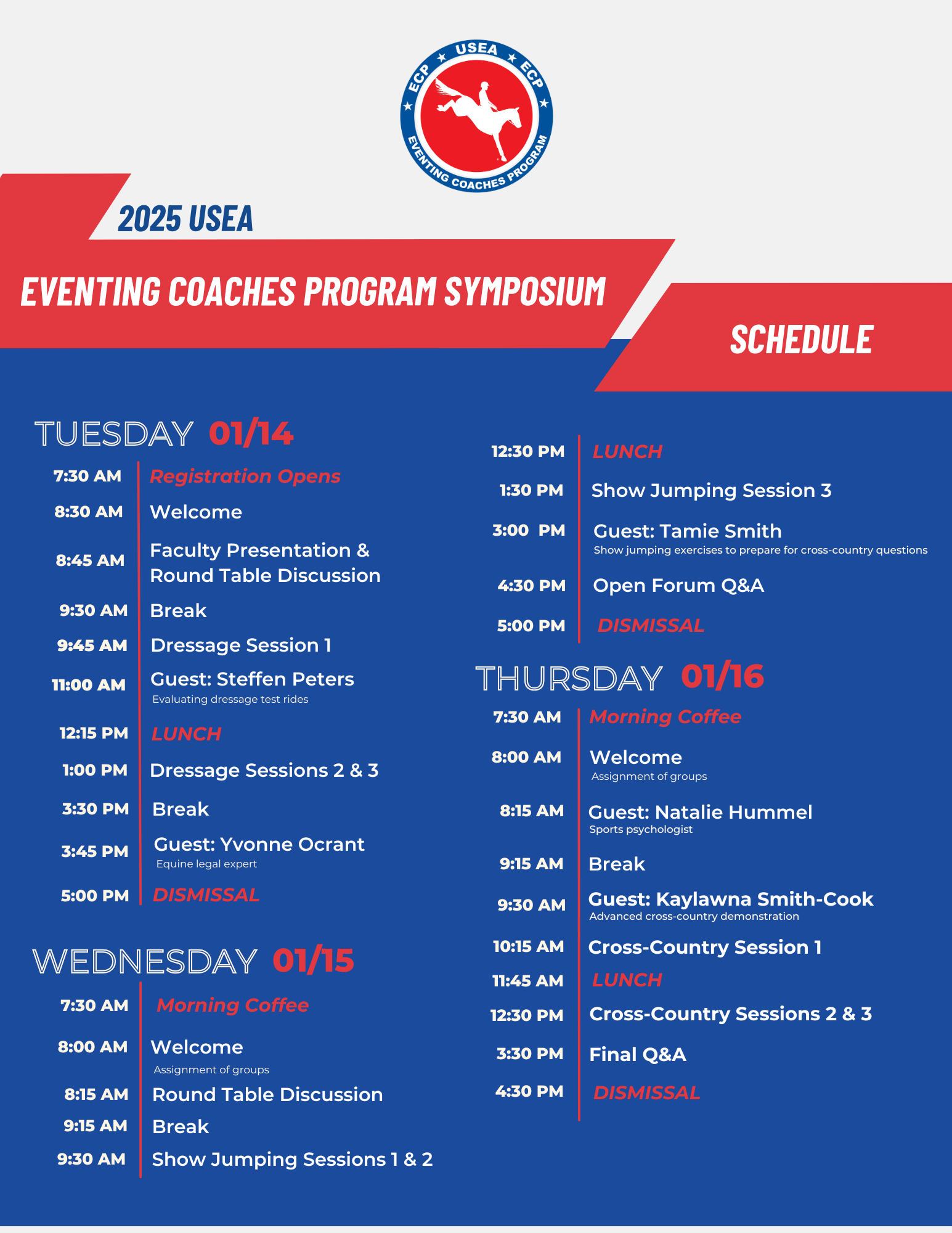 In addition, five guest speakers will be featured on this year's schedule: Olympic dressage rider Steffen Peters, sports psychologist Natalie Hummel, equine legal expert Yvonne Ocrant, five-star eventer Tamie Smith, and upper-level eventer Kaylawna Smith-Cook.