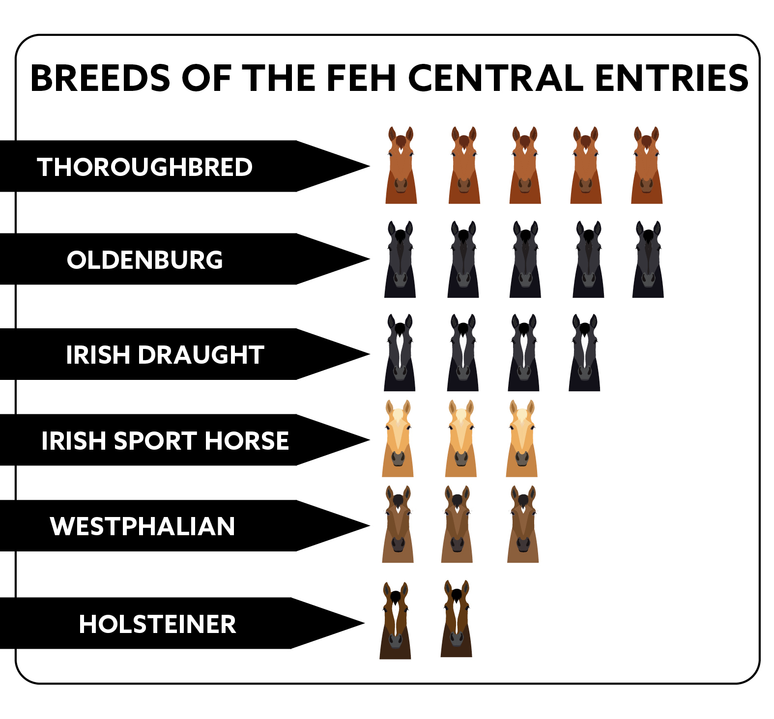 - The Thoroughbred and Oldenburg are the most popular breed sin this year’s FEH Central Championships with five entries each. Coming in a close second with four entries is the Irish Draught breed.