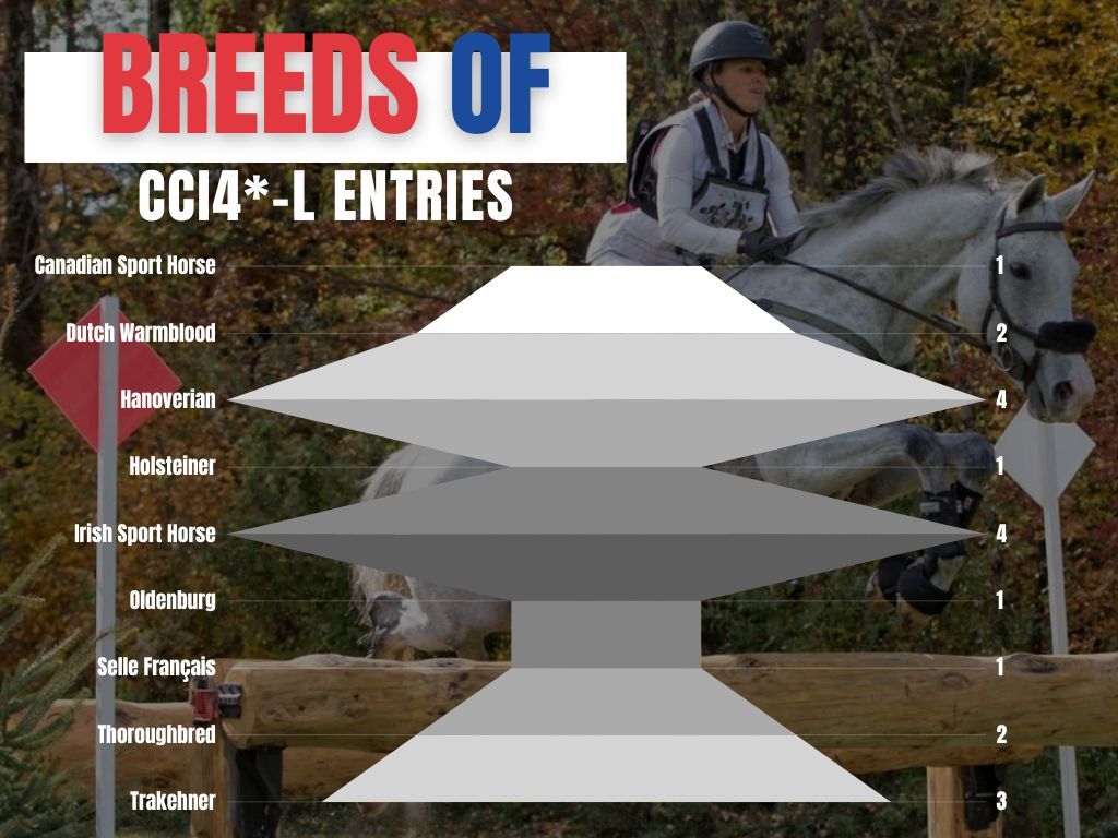 - Nine different breeds make up the 19-horse field, led by four Hanoverians and four Irish Sport Horses. Thoroughbreds had a particularly strong influence on the results of last year's CCI4*-L at Bromont when Twilightslastgleam ridden by Saville and Wabbit ridden by Jessica Phoenix launched up the standings with the two fastest times on a wet cross-country course where no one finished inside of the optimum time. The two Thoroughbreds competing in 2023 are Steven Berkowitz' Chilly (Zanjero x Tax Rob) ridden by Lillian Heard Wood and Juliana Hansen's Lovely Assistant (Colonel John x Absolutely Lovely) ridden by Hanna Bundy.