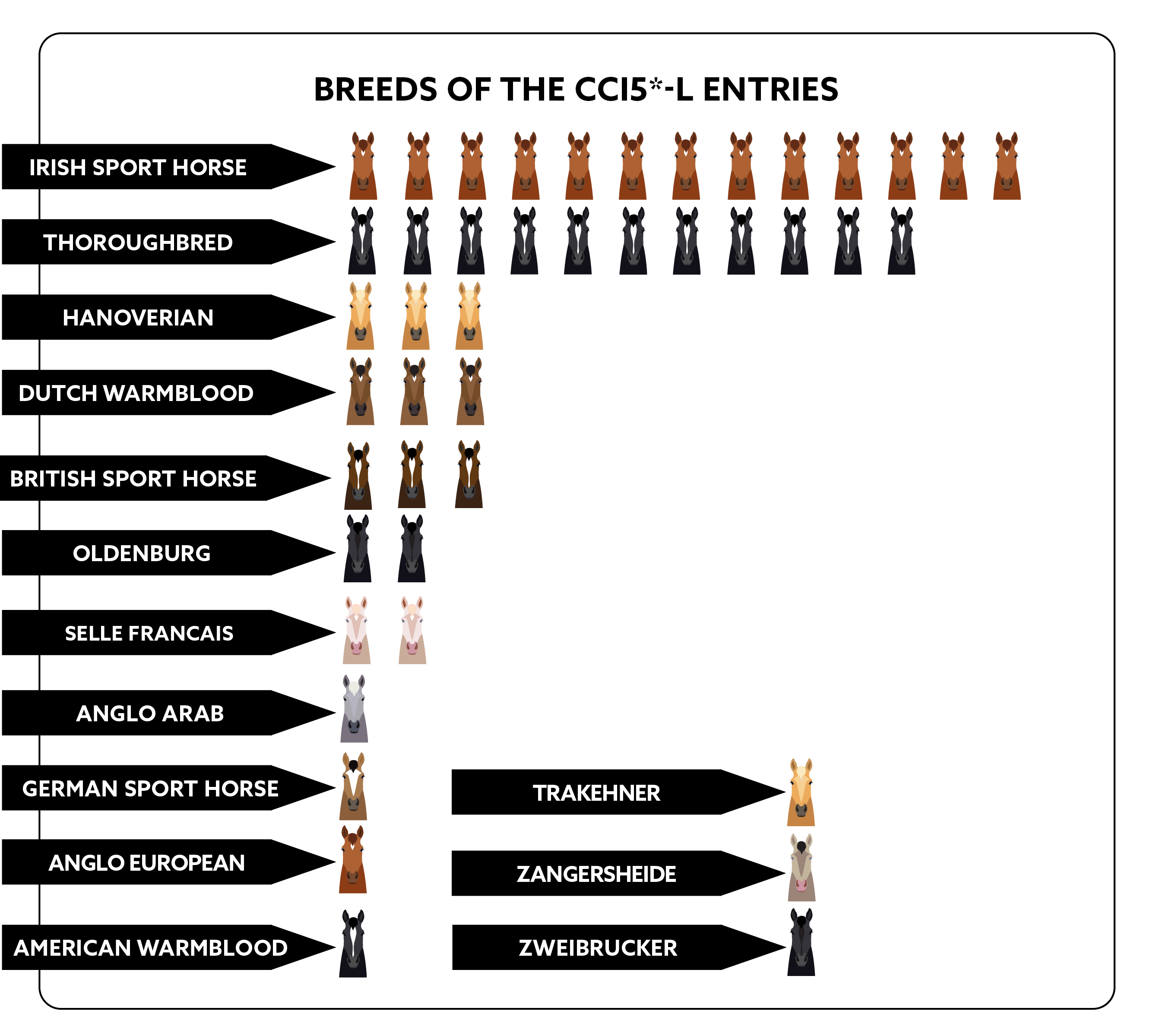 - The Irish Sport Horse is the most represented breed in the lineup with 13 horses descending from Irish bloodlines. The runner-up is the Thoroughbred with 11 entries.