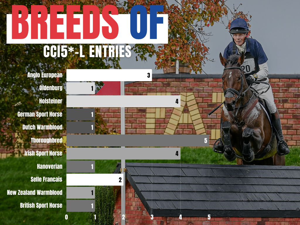 Thoroughbreds reign supreme as the most popular five-star mount in this year’s entry list with five horses from racing roots. The Irish Sport Horse and Holsteiner fall closely behind with four entries each.
