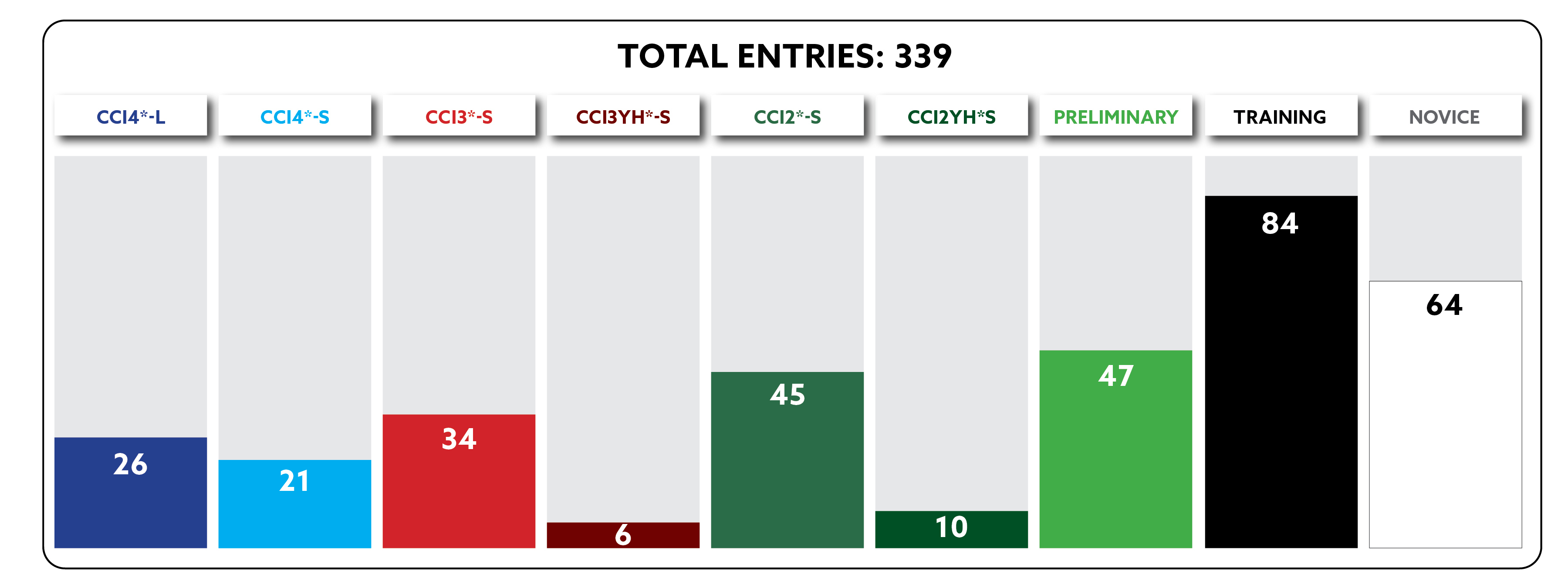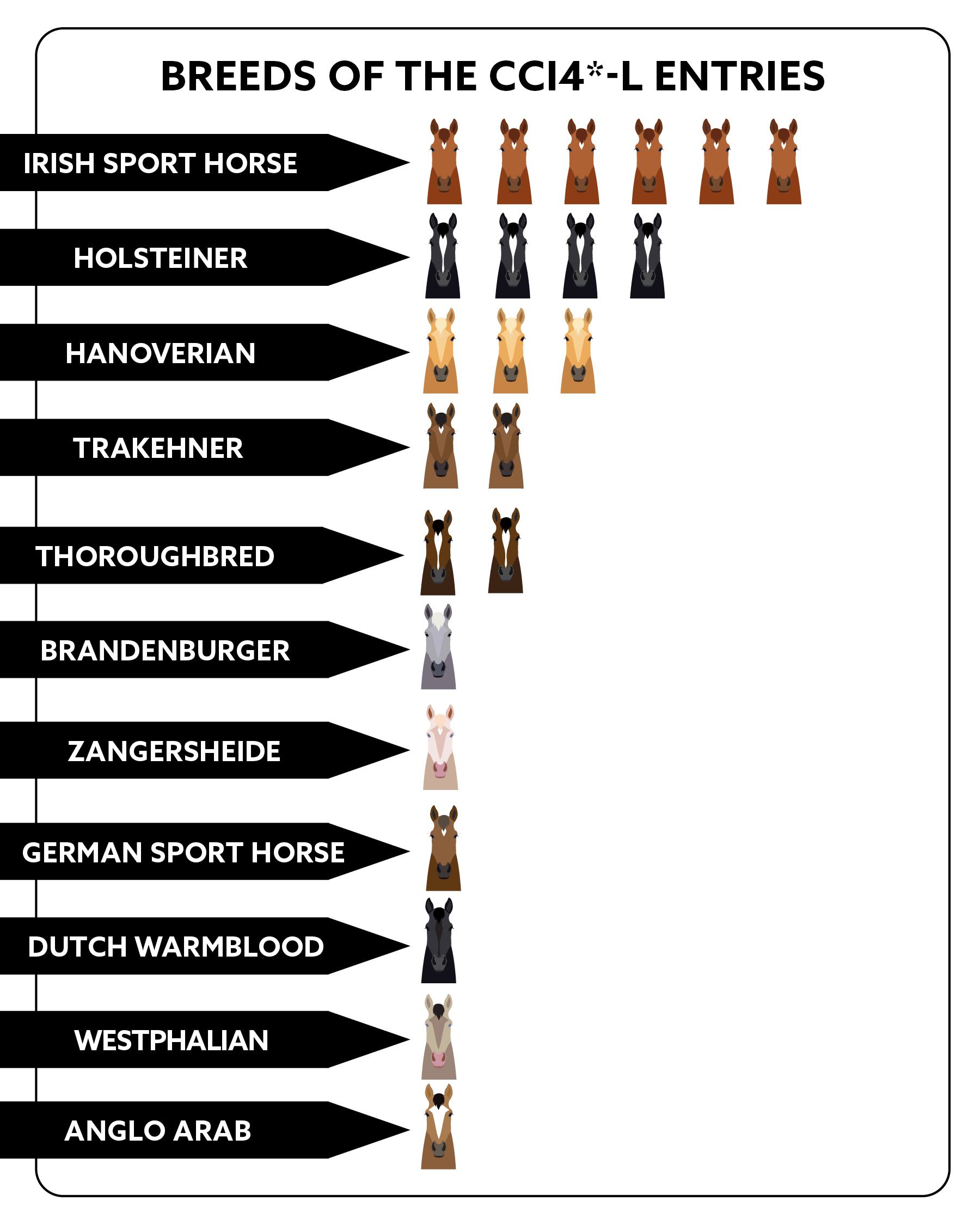 - The inaugural CCI4*-L at Morven Park will feature 26 entries. Of those 26 entries, there are only two riders with multiple horses: Buck Davidson who will be presenting Rolo 7 LLC’s 8-year-old Irish Sport Horse gelding Cooley Candyman (Sligo Candy Boy x Dashing Hill) and Karleigh Wright’s 10-year-old Thoroughbred gelding Sorocaima (Rock Hard Ten x Sankobasi) and Canadian rider Jessica Phoenix who has the ride on her own and Jim Phillips’ 11-year-old Thoroughbred gelding Wabbit (Line of Departure x No Kissing) and her own 10-year-old Trakehner gelding Watson GS (Humble GS x Woodstock GS