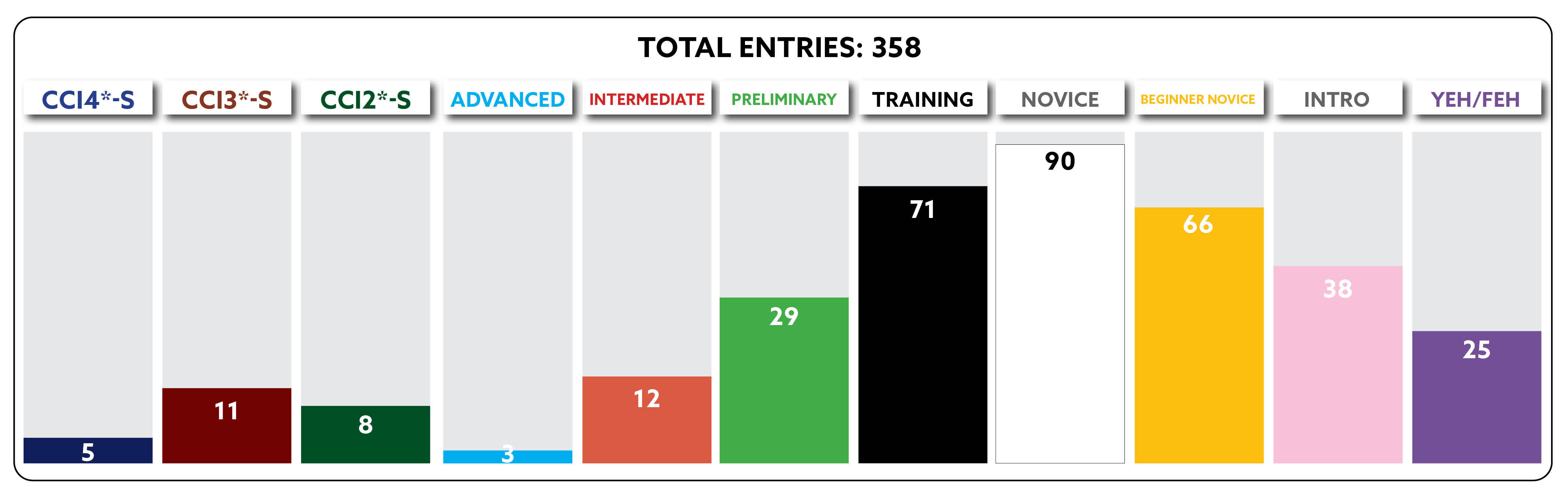 - There are over 300 entries across all divisions offered this weekend. The CCI4*-S has five entries, the CCI3*-S has 11 entries, and the CCI2*-S has eight entries. The individual division with the largest field is the Open Preliminary division with 29 entries on the roster.
