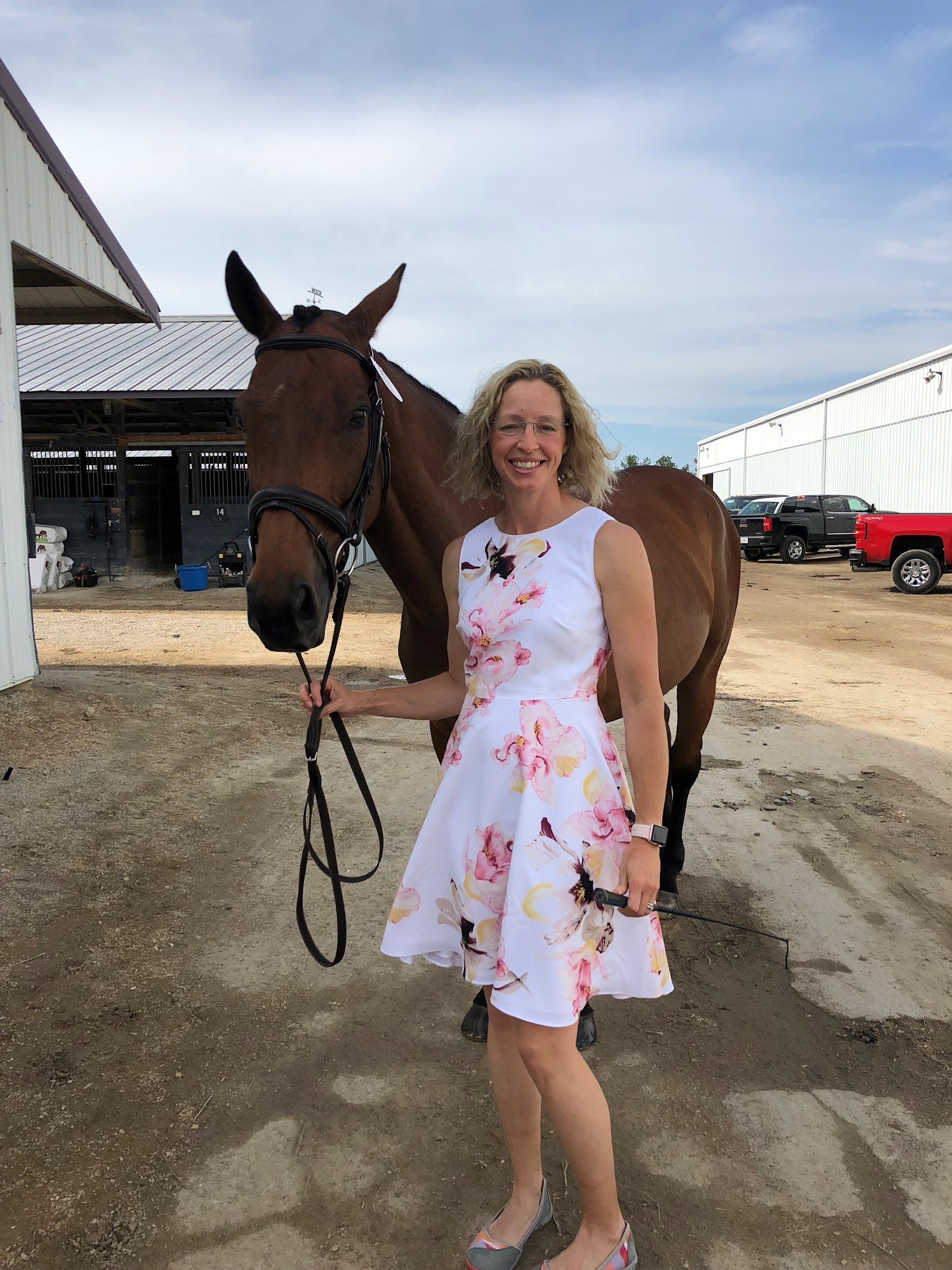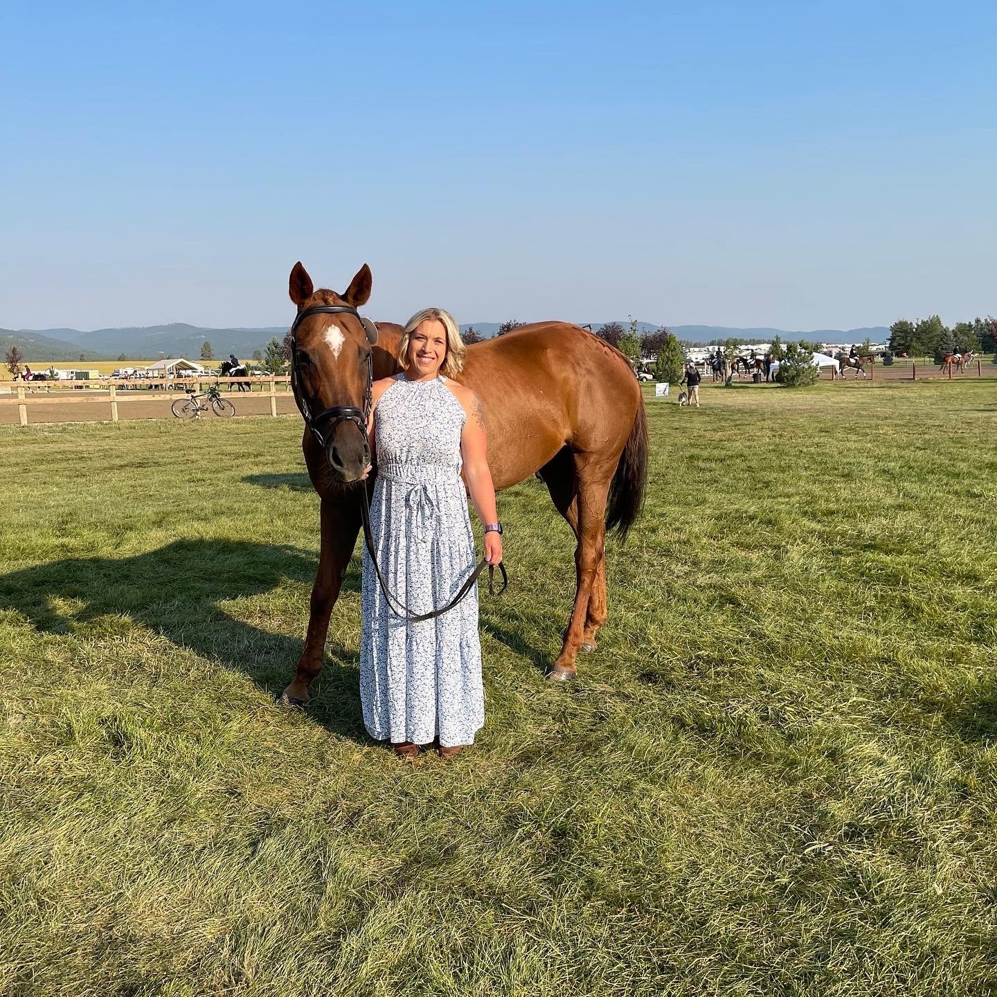 In July 2021, Hilary Naleway rode her own 17-year-old off-the-track Thoroughbred mare, Sweet Radiance aka Sadie in the Training Three-Day at Rebecca Farm. Naleway described her classic series weekend as “one of the most fun events she’s done.” For the first and third horse inspection, she wore dresses that were appropriate and complimented her chestnut mare perfectly.