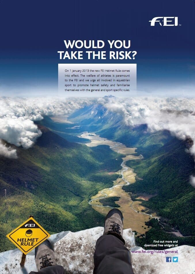 “The helmet rule, which was unanimously adopted by the FEI General Assembly in 2011, is a significant step forward towards the better protection of our athletes,” said FEI Secretary General Ingmar De Vos. “Beginning 1 January 2013, protective headgear will be compulsory at all FEI events and we strongly encourage everyone involved in international equestrian sport to familiarise themselves with the new general and sport-specific rules. The welfare of all our athletes, human and equine, must be protected.”
