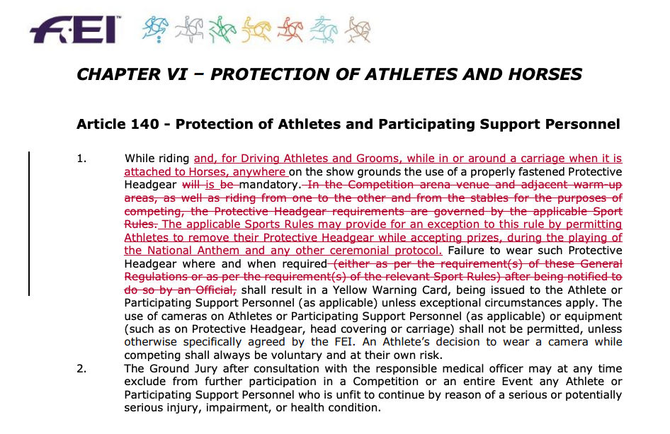 The helmet rule used to allow individual disciplines to choose their own head protection rules, but the new rule requires helmets for all FEI disciplines at all times while mounted. Failure to wear a helmet will result in a yellow card.