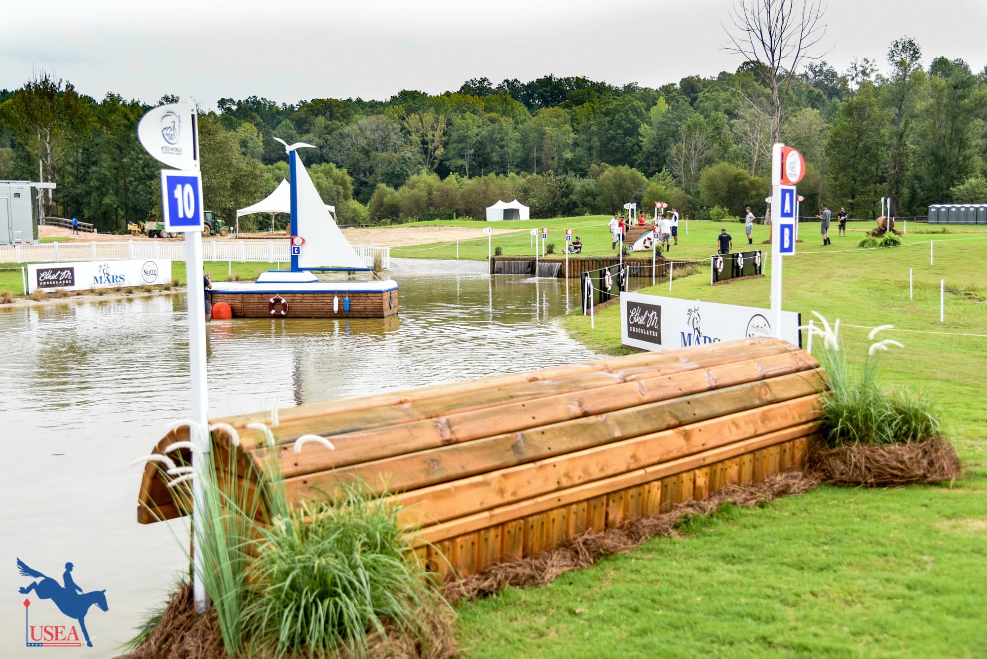 World Best Bank is followed quickly by the second water jump on course, Mars Sustainability Bay. This combination comprises four efforts for the direct route: the drop into the water at fence 10AB, the boat in the water at fence 10C, the bank out at fence 10D, and the wedge at fence 10EFG. There are two other paths that riders can take with a variety of element combinations. Riders can choose to jump the left-hand option at fence 10A, which remains on dry land before horses gallop into the water, followed by a boat in the water fence 10B, and then can choose from two different step options which lead to different combinations of stumps, roll tops, and cabins.