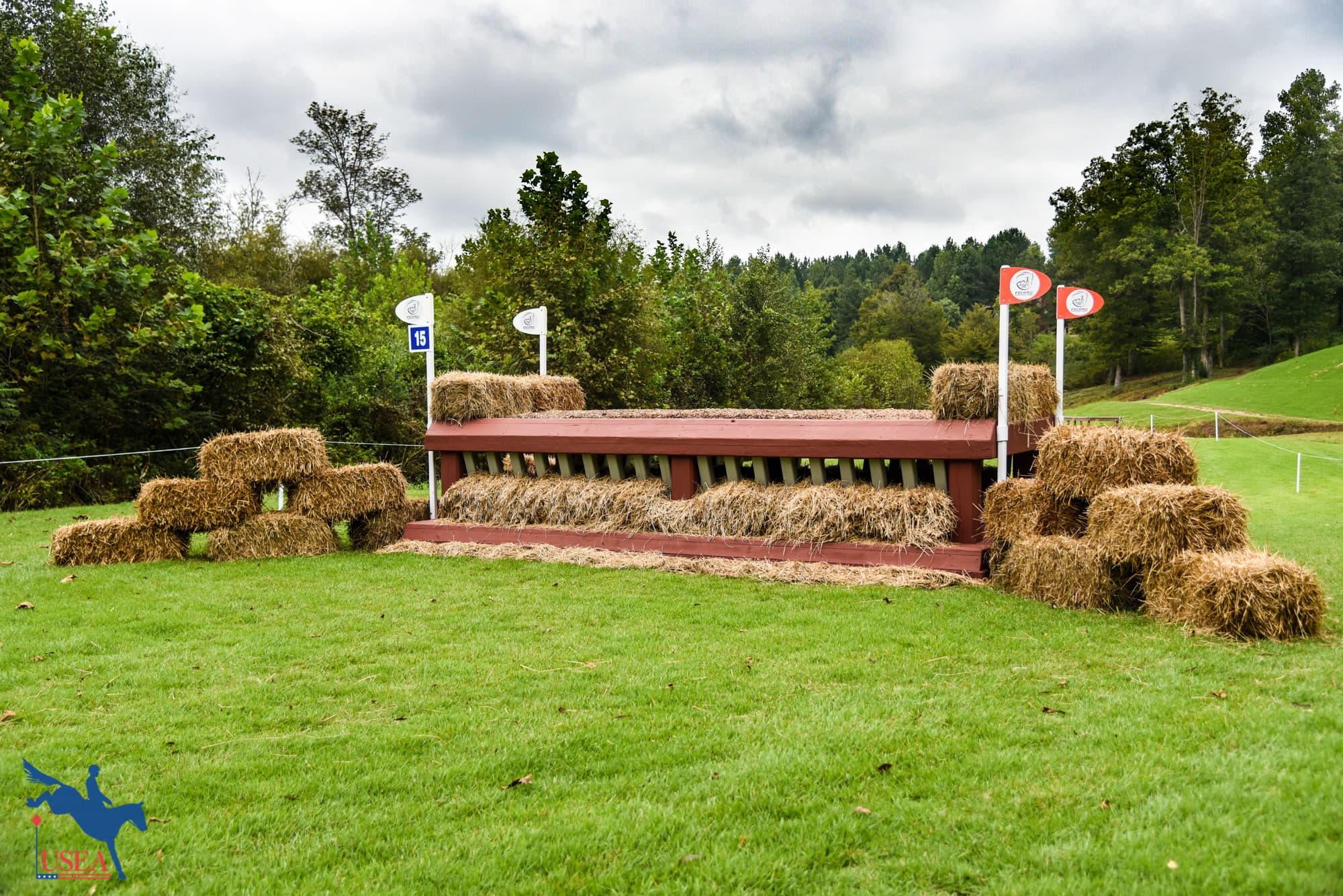 Riders gallop away from the water and continue south, picking up fence 11, the Bee Trakehner and fence 12, Over Mountain Victory Trail Wall, before turning left across the second of three bridges on course and passing their fourth minute marker. Riders then come to fence 13AB, Apple Country, where they can take their pick between two different bending lines from large table to large table.