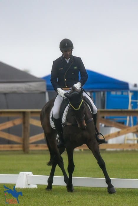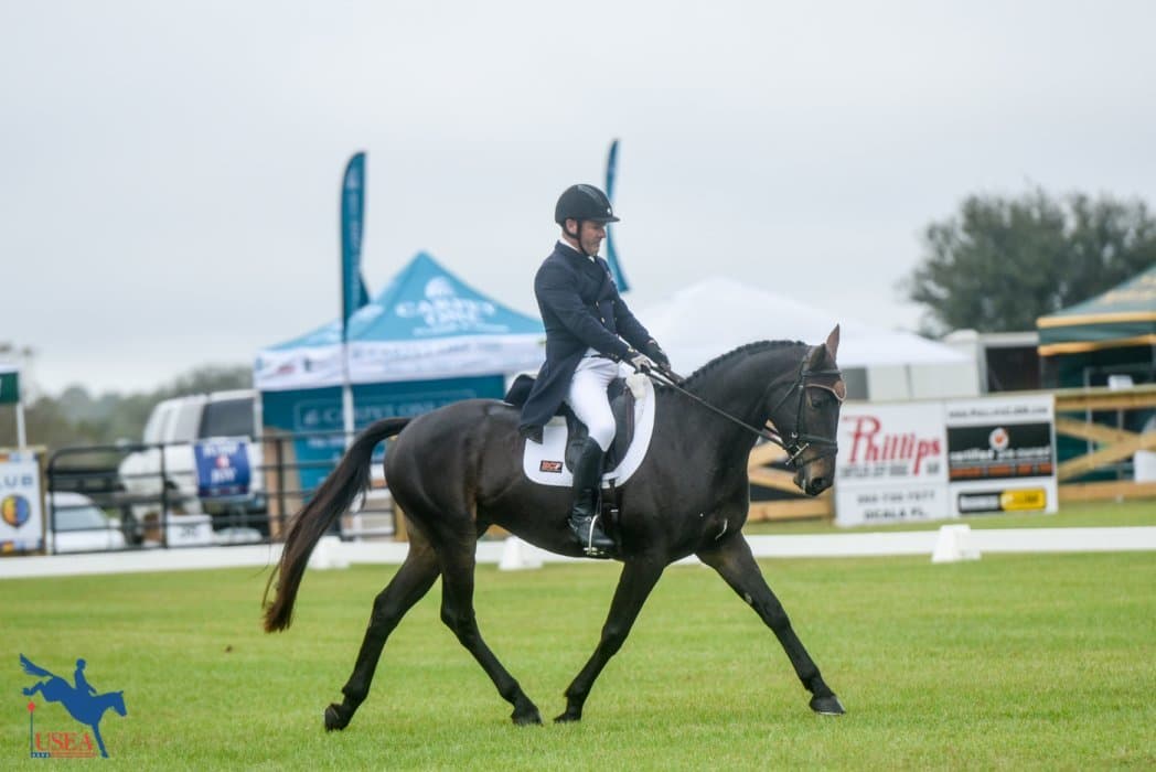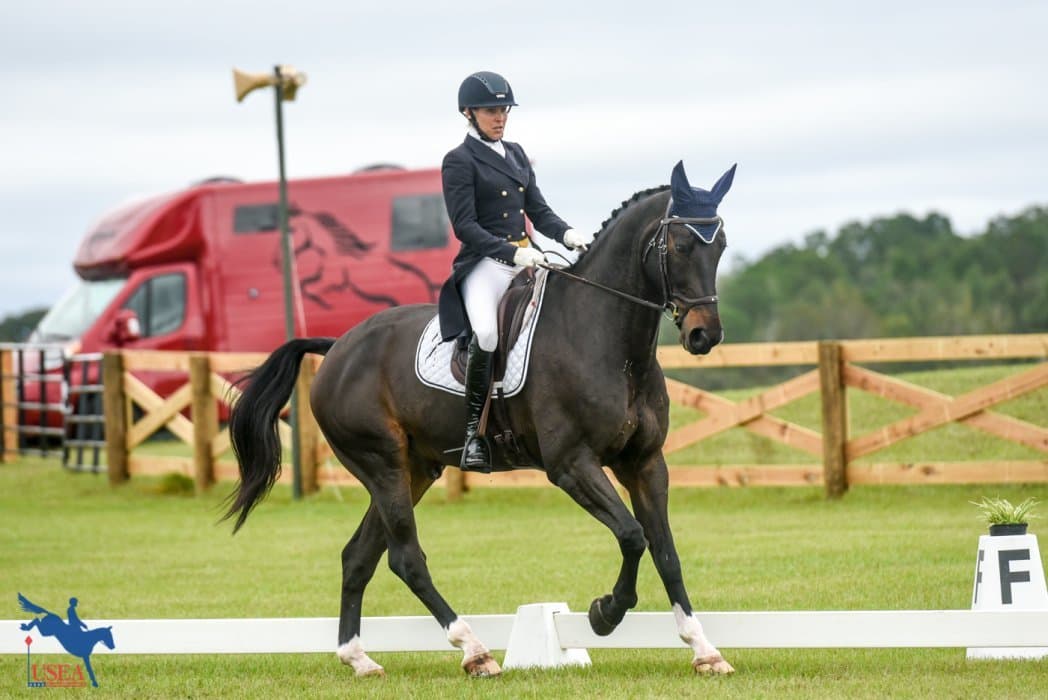 Fernhill By Night is no stranger to the top spot on the leaderboard after the dressage phase of an event and today’s CIC3* at the Ocala Jockey Club International Three-Day Event fit right in with his tradition. A night of storms and a brisk morning (for Florida) made for some tense horses and only two managed to break into the twenties, but “Blackie” kept it together to earn a 27.2 with Liz Halliday-Sharp.