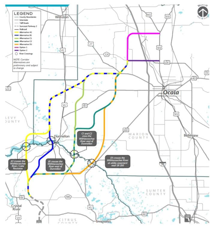 Five proposed routes were unveiled two weeks ago that would connect north Central Florida with the Tampa area and run through Citrus and Marion counties. All begin at the end of State Road 589 and ultimately end at U.S. Highway 301 north of Ocala using one of two routes. While the southern route would follow the existing State Road 326, the proposed northern route does not mirror an existing road and would require a new interchange at Interstate 75.