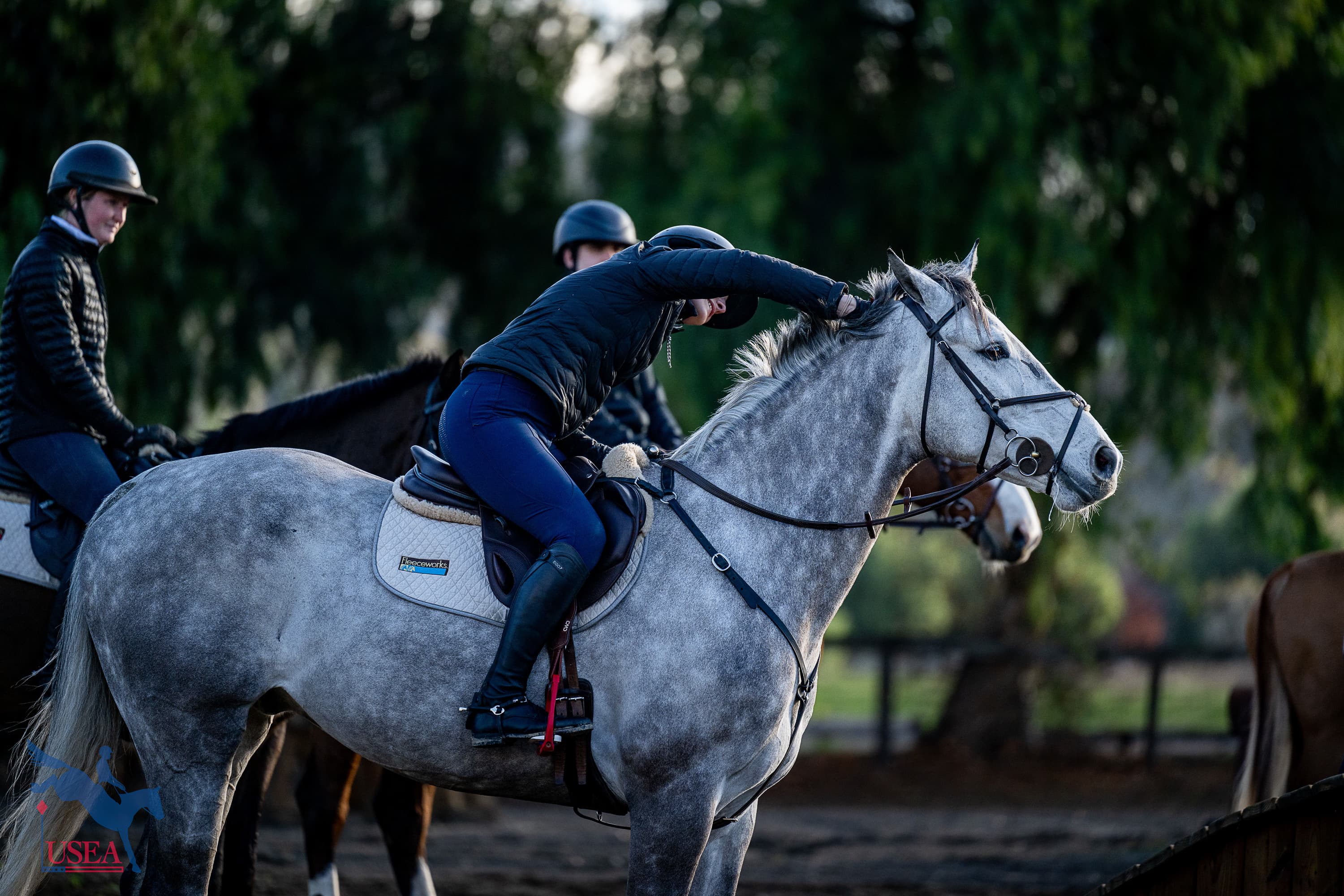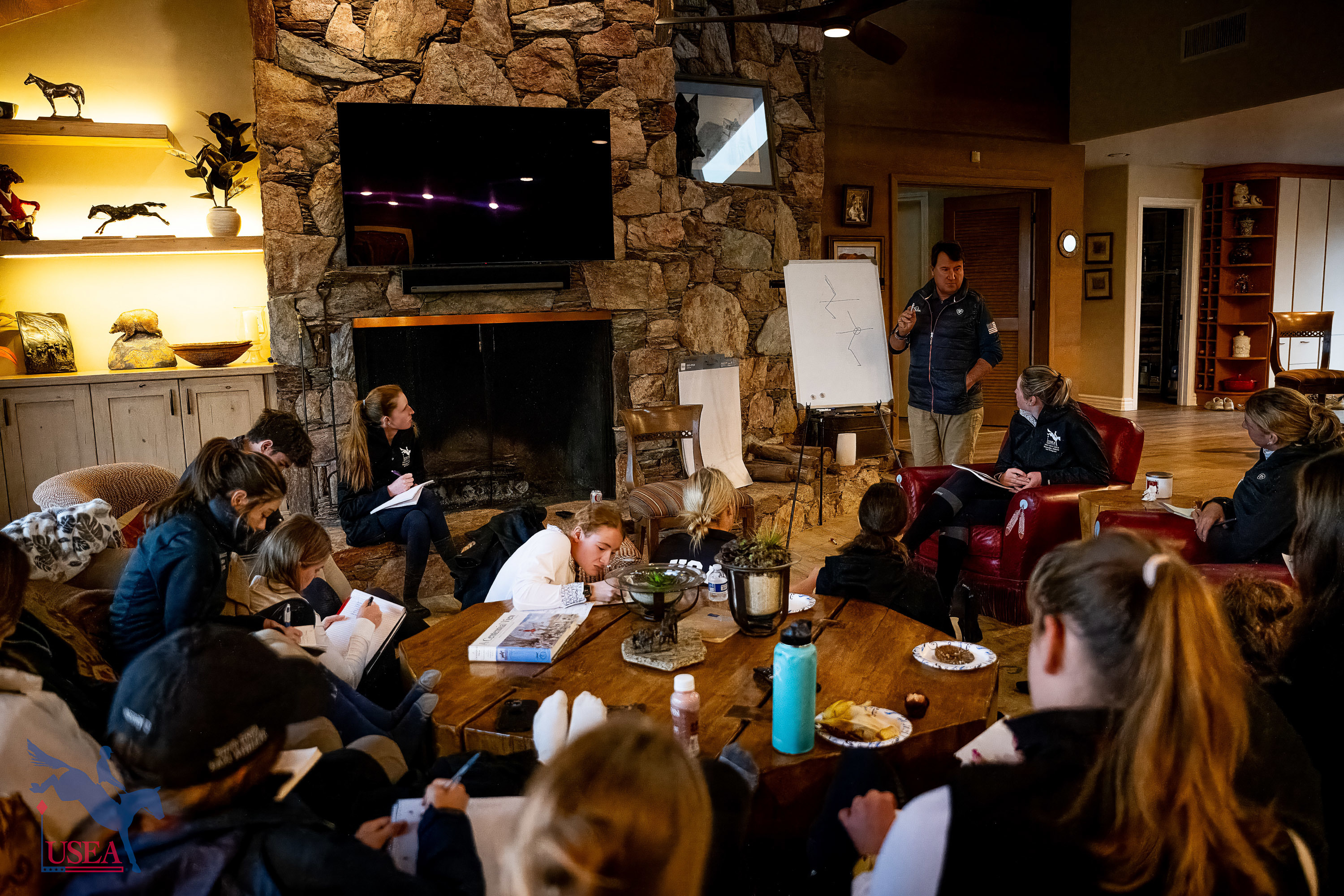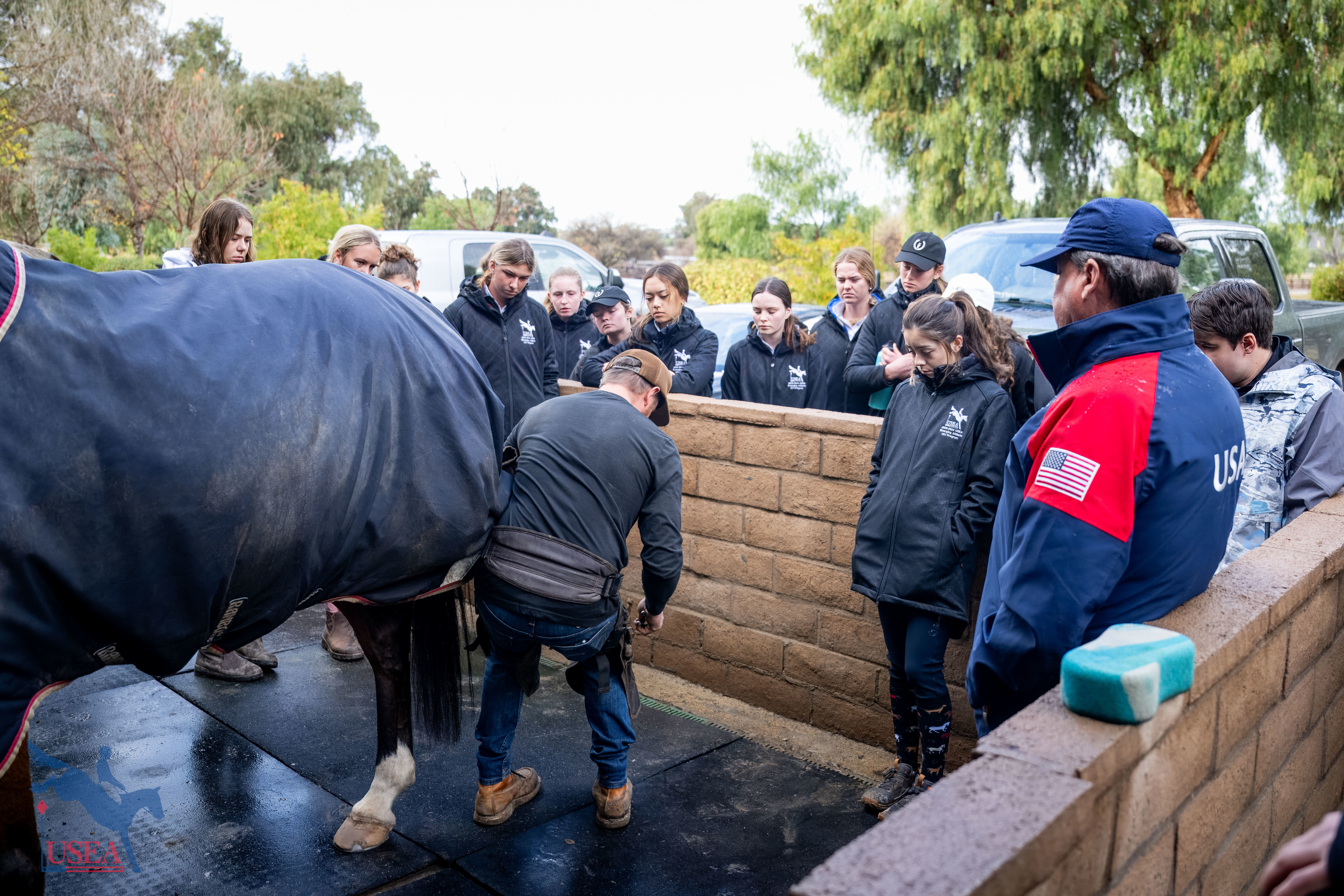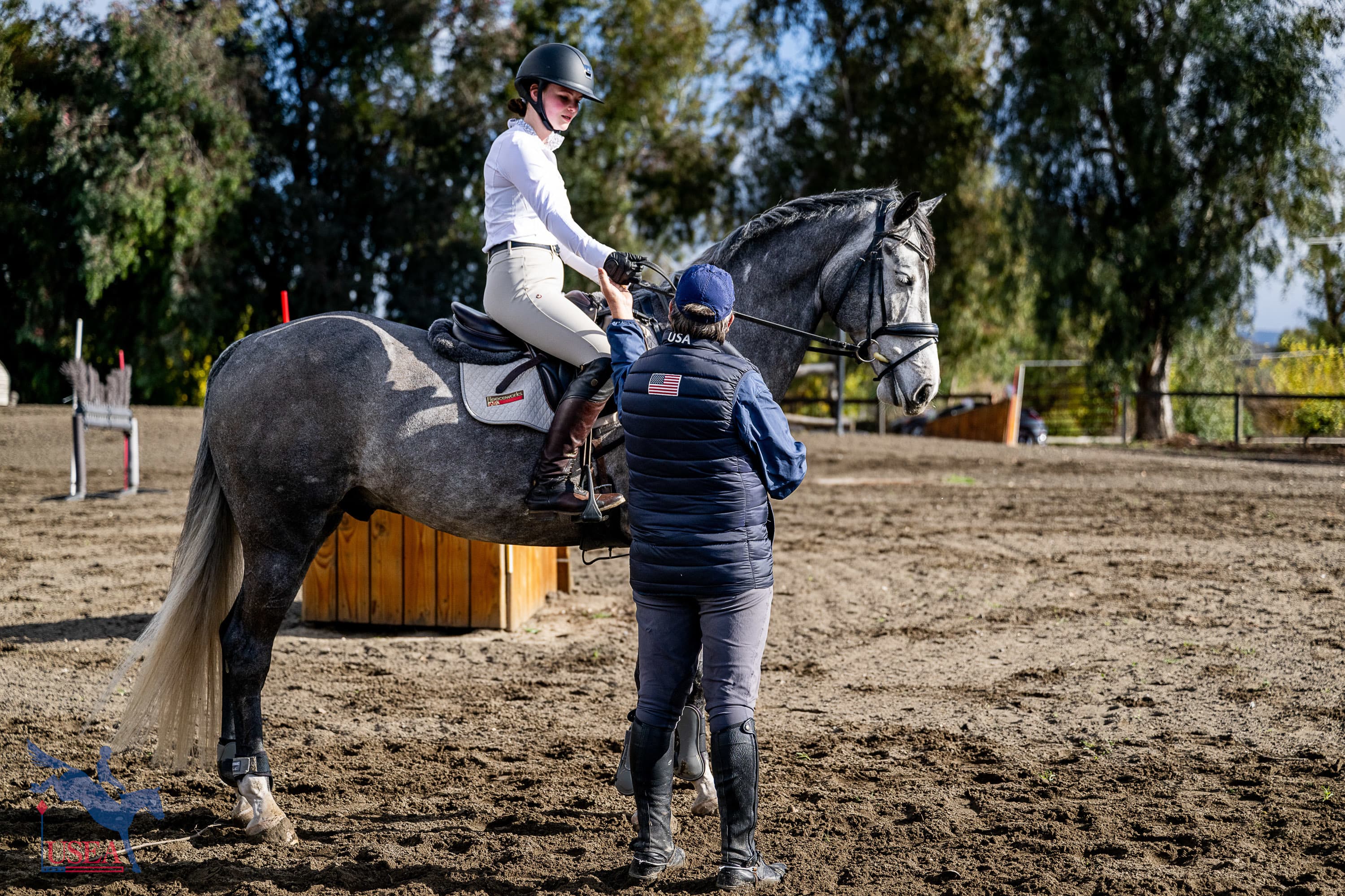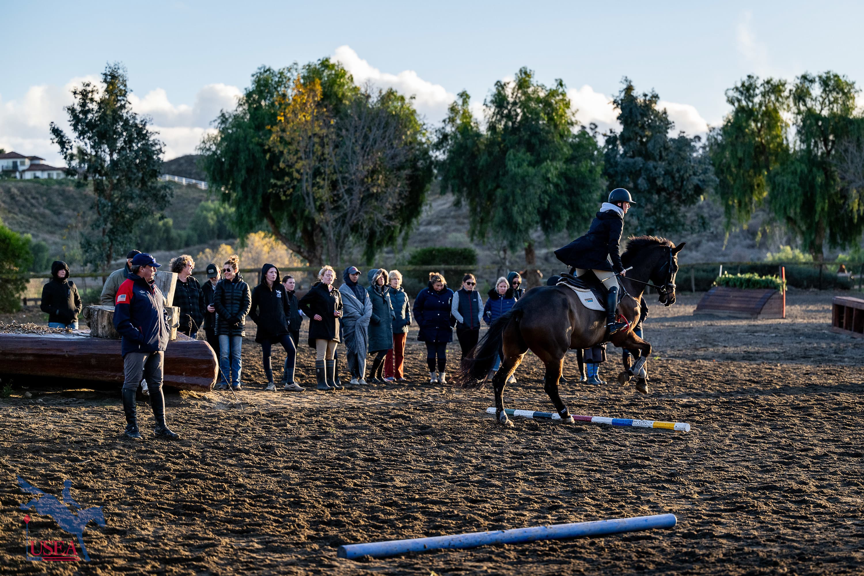 Temecula, Calif.—Jan. 3—Horsemanship and show jumping fundamentals were on the docket of day 2 of the USEA Emerging Athlete U21 National Camp at Kingsway Farm. From grooming to farrier techniques to course design questions to the concept of “next,” no stone was left unturned.