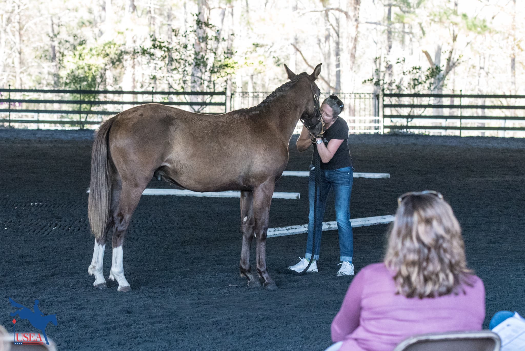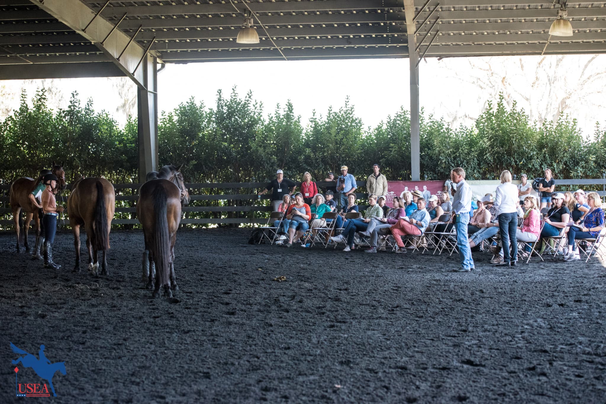 Attendees meet the horses participating in the mock 4-year-old undersaddle class. USEA/Leslie Mintz Photo.