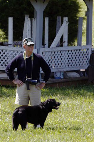 Jim Wofford (Part 1, Part 2, Part 3): Who shares his always popular and on-target views of modern eventing, his family history, and also his hobbies: “I love to fly fish, and during the winter I do a great deal of duck hunting, usually with a Black Lab beside me. Like the one laying here with me, Nacho, listening to make sure I’ve got it right. We’ve just taken his daughter into the family; her name is Peaches. She’s locked in the garage right now because she’s a bandit.”; (Right: Jim & Nacho at a recent clinic. Josh Walker photo)