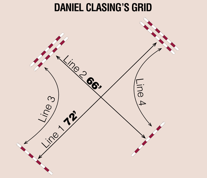 After the horses and riders are warmed up and easily popping over the warm up oxers, I will decide which line they should start with. For the lazier lower-level horse, or the more experienced upper-level horse, I will start with Exercise #1. For the quicker lower-level horse, or a greener horse, I will start with Exercise #2. For the purpose of this article, let’s assume we are working with the quieter horse and start with Exercise #1. Regardless of which exercise I start with, I will always set the jumps to a little below the competition height of the pair that I’m teaching. Once my students have successfully negotiated the exercise a few times, I will raise the jumps up to the height that they are currently competing at.