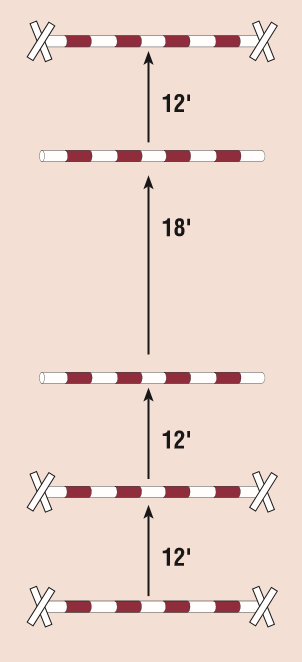 Please note that if you don’t have cavelettis, that isn’t a problem. You will just have to get creative. I often use flower boxes or mini brick walls that add a degree of difficulty because they are so narrow. And if you don’t have any type of caveletti or boxes, you can simply use additional standards and jump rails, and just keep the jumps to 18” or so.