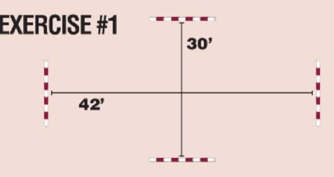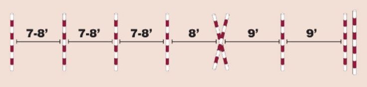 The purpose of the box of rails on the ground is to introduce the idea of stride length regulation in a less demanding way than the seven to eight foot canter rails in front of the cross rail. The 30' rails are an easy three strides, and the 42' rails are an easy four strides. The hard part with these rails is that since there is not a rail for every stride, your horse (and you) can make his own choice, and it will not always be the right one. The positive is that, especially with green horses, these single rails on the ground are more forgiving than the series of rails before the cross rail.