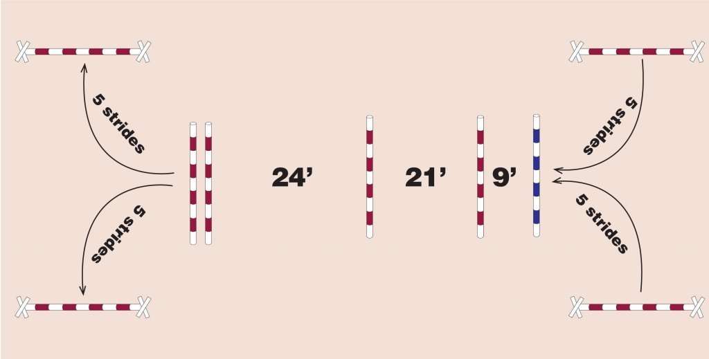 Once you are confident that you and your horse are properly warmed up, then you are ready to start building the jumping exercise. Depending on your level, it is easiest to just start with all of jumps as poles on the ground. You will start over one of the 18” verticals, then bend five strides to your gymnastic line, and then finish by turning the opposite direction over another 18” vertical. It does not matter what direction you start, but the idea is to create a figure-eight pattern over the fences.