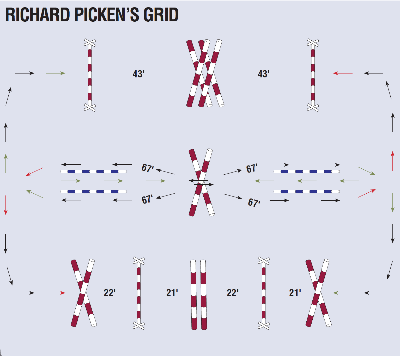 From here we’ll move to the bottom line, and once again I like to start by having the riders go through it a few times with the jumps taken out before adding in the jumps. I often have people question why the distances are just slightly different for this line, and my reason is quite simply: while it’s only a foot difference, it’s enough to make a difference. Keep in mind that this particular exercise is a little easier when you approach it from the 22' distance, so I do like to start with that approach. As I mentioned earlier, I like to mix things up a bit so that the horse – and rider – gets used to thinking throughout their course. The goal is to be a proactive rider, not just a reactive rider.